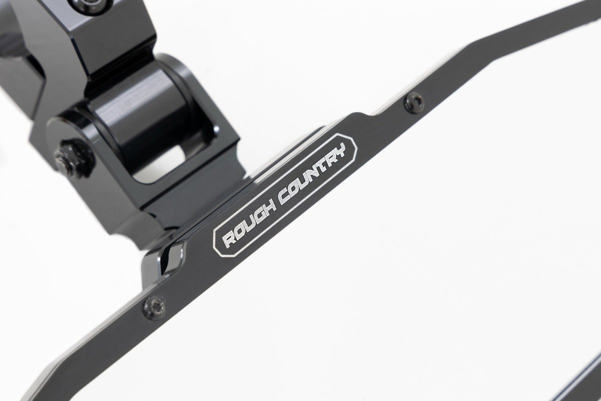 The Rear View Mirror - Rough Country - Aluminum - Black is a state-of-the-art add-on designed to enhance your off-road driving experience. With its durable construction and sleek design, this mirror ensures optimal visibility while driving your UTV, no matter the environment.