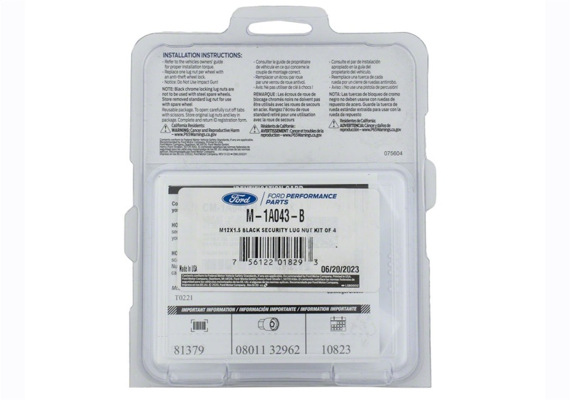 M-1A043-B5 Is The Same Kit That Incl. An Additional Security Lug Nut For Use On The Bronco Rear Mounted Spare Wheel/Tire. These Are The Perfect Security Solution For Use w/Our M-1012K-BR/M-1012K-BSB Vehicle Black Lug Nut Kits. Fits 2019-2023 Ford Ranger; Fits 2021-2023 Ford Bronco Sport; Fits 2018-2021 Ford EcoSport. Fits 2020-2023 Ford Escape/Lincoln Cosair; Fits 2015-2021 Ford Fusion/Lincoln MKZ. These Are The Perfect Security Solution For Use w/Our M-1012-BR/M-1012-BSB Wheel. The Black PVD Finish Provides Excellent Scratch; Wear And Corrosion Resistance. Ford Racing M12 x 1.5 Black Security Lug Nut Kit - Set of 4. The Black PVD Finish Provides Excellent Scratch. Wheel Lug Nut Kit; Kit Of 4; Black; M12 X 1.5;. Fits 2020-2023 Ford Escape/Lincoln Cosair. M12 X 1.5 Black Security Lug Nut Kit of 4. Kit Contains 4 Security Lug Nuts And Key. Fits 2015-2021 Ford Fusion/Lincoln MKZ. Fits 2021-2023 Ford Bronco Sport. Wear And Corrosion Resistance. Fits 2018-2021 Ford EcoSport. Fits 2019-2023 Ford Ranger. Fits M14 x 1.5 Wheel Stud. Wheel Lug Nut Kit. Wheel Lug Nut