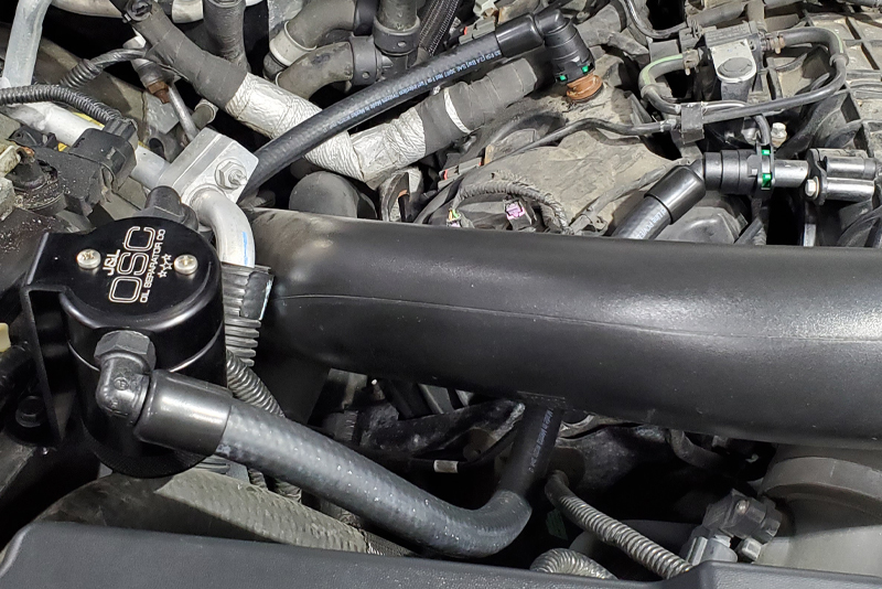 During the process of venting crankcase pressure back through your intake track, large amounts of oil, in the form of vapors can gather/accumulate in your intake tube, intake manifold runners and even dilute your gas, lowering its octane level. This happens on all engines and is even worse with forced inducted vehicles (supercharged and turbocharged) as crankcase pressures are increased. To combat this, we have developed an oil separator of our own design. Milled from solid billet aluminum this is a rock-solid piece. It has a knurled tank base for easy removal to drain the spent oil and an O-ring seal to prevent any leaks.
