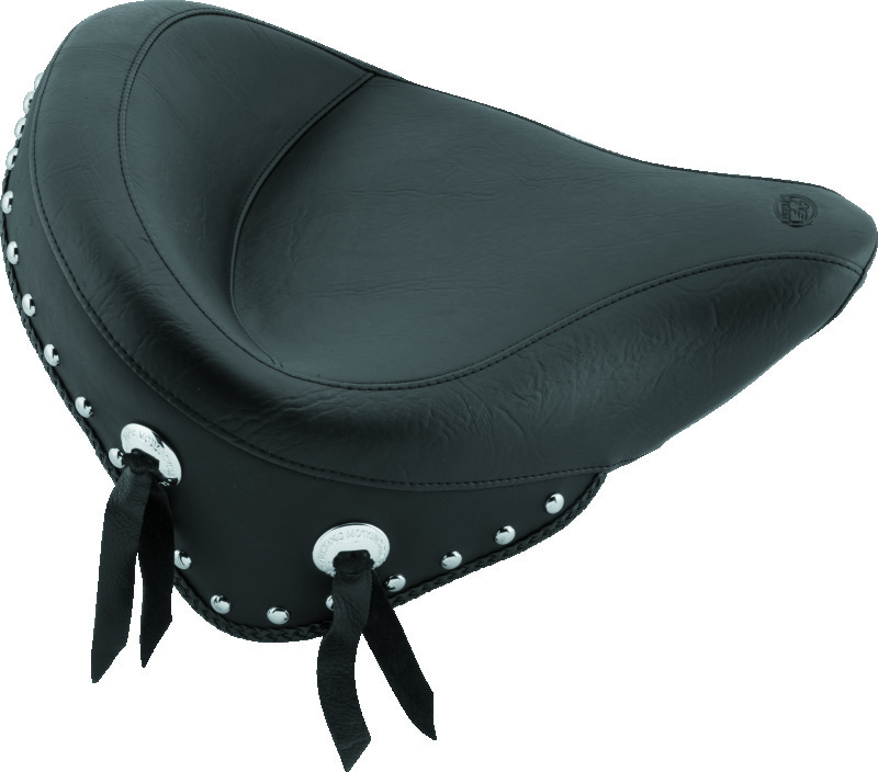 Contoured to hug the tank and felt-backed to protect the paint, Tank Bibs feature braided edges for unique style and utilize stock mounts for easy installation. Available with or without a pouch in your choice of plain or studs and a concho. Decorative studs are chrome-plated brass, not steel, and will never rust. Conchos are custom made from heavy die-cast zinc rather than thin stamping, and are hand-tied with genuine leather straps. Pouch Tank Bibs offer a custom look with sensible convenience and feature a soft, fabric-lined interior. The flap is easy to open and closes tightly via hook and loop.. Mustang 04-09 HondaVTX1300C, 03-09 VTX1300 Retro, 03-07 VTX1300S Tank Bib w/Studs - Black. Tank Bib, Studs