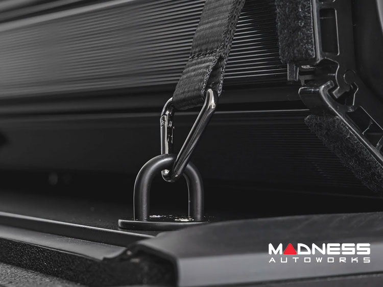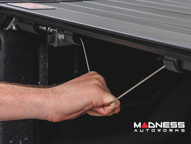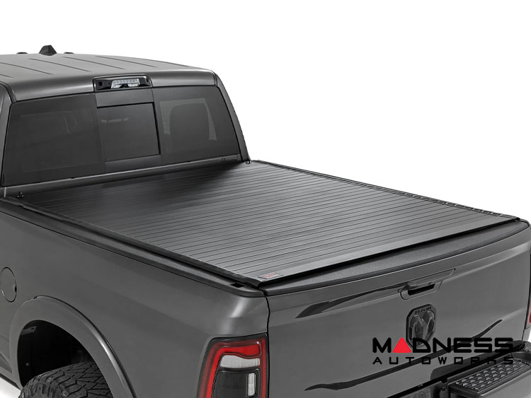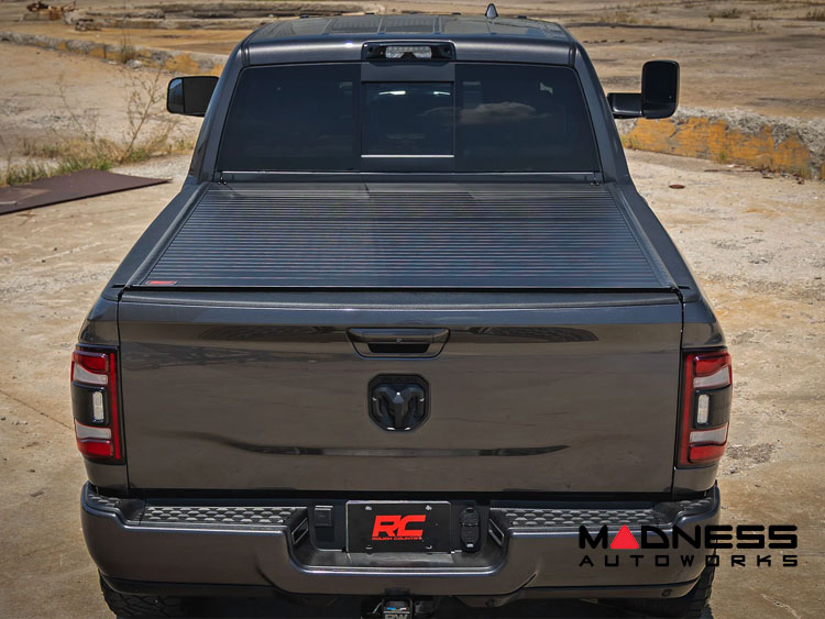 The Dodge Ram Bed Cover features an innovative design that combines functionality with a streamlined appearance. With its flush, low-profile design accentuated by a matte black finish and sturdy aluminum slats, this cover not only protects your gear but also enhances the overall look of your truck. Its quick-access feature allows you to roll up the cover and access your cargo in seconds. A simple cable pull unlocks the system, while the auto-latching mechanism ensures the cover is securely in place when closed, making it easy and efficient to use. Built with a black powder-coated aluminum frame, this cover is engineered for strength, resists corrosion, and supports up to 600 lbs of evenly distributed weight, making it a dependable choice for any adventure.