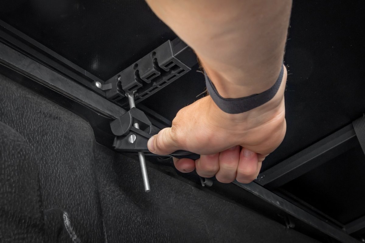 The cover sits securely on the bed rails, providing an all-weather seal that protects your cargo from the elements. It's engineered with convenience in mind; it arrives completely assembled, ensuring a no-fuss installation. No need for drilling or tools, thanks to the patented quick clamp system that lets you secure your cover swiftly and efficiently.