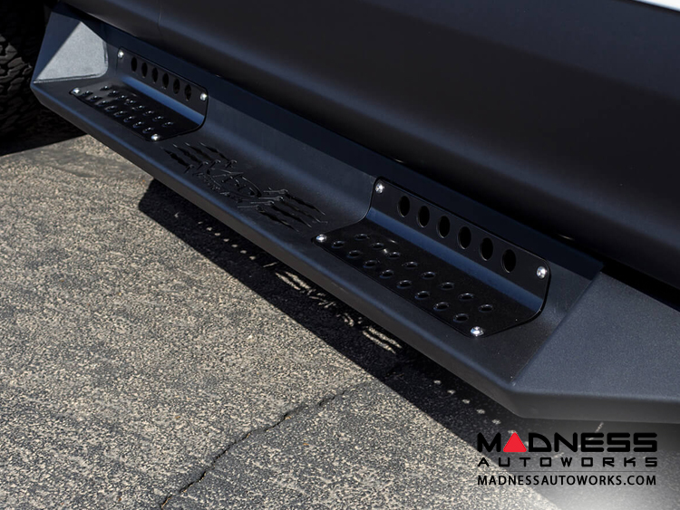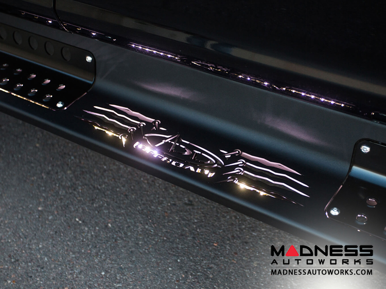 The Honey Badger step was designed to accompany the Honey badger front and rear bumpers but just as well does fine by its self! The steps are given a laser cut Honey Badger logo, feature removable step plates in case you ever wanted to paint match them to your truck, and can feature lighting to add extra confidence in the dark.