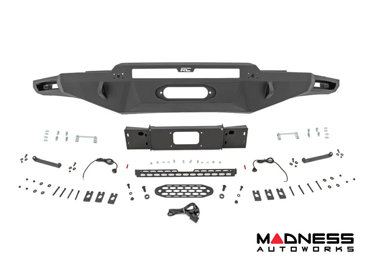 Built to provide more ground and tire clearance, this bumper allows you to conquer challenging off-road obstacles without the worry of scraping or getting hung up. The exterior is made from 11-gauge steel, while the inner structure features 7-gauge steel, ensuring your bumper is ready to withstand the harshest conditions. Additionally, this bumper comes ready to accommodate optimized lighting options, with space for 6-inch slimline lights on the wings and a 20-inch single-row light bar in the center. To top it off, we include smoked amber LED lights to cover sensor holes on non-optioned trucks, blending function with style.