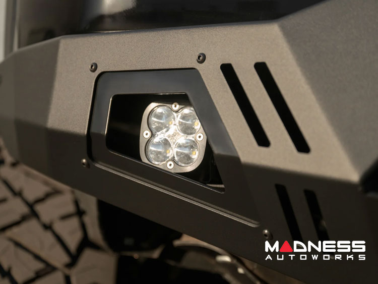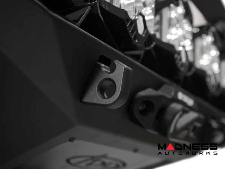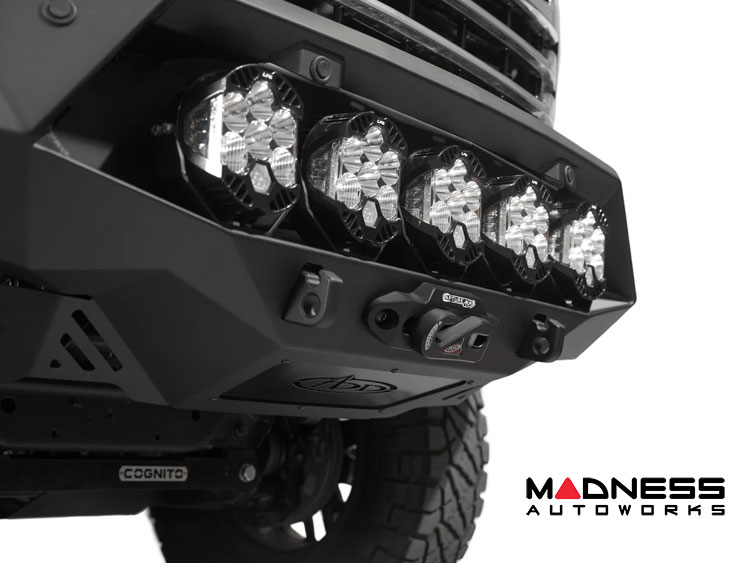 The Bomber Series Front Bumper stands out with its intricate design that allows for diverse lighting configurations. Whether you're navigating dark trails or needing extra illumination for night-time driving, this bumper has you covered. The center cutout is specifically tailored to accommodate your choice of lighting, giving you the flexibility to customize based on your preference. Choose to fit either five Baja Designs LP6 lights or six RIGID Industries 360 Series 6” round lights. Alternatively, opt for two radiused 40-inch light bars for maximum road illumination. Additionally, each wing of the bumper features mounts for 3-inch cube lights, ensuring no road is too dark or path too obscure.