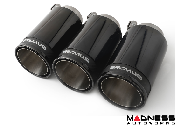 The Honda Civic Tail Pipe Set - Remus - 98mm - Street Race Black Chrome - '2023+ is a must-have component for enthusiasts aiming to elevate the performance and aesthetics of their 2018 Honda Civic Type-R FK8 2.0T. This exceptional tail pipe set is meticulously engineered to match the distinct specifications of the Type-R, ensuring a perfect fit and optimized airflow for enhanced performance. Creating a harmonious balance between robust power output and sleek visual appeal, these tail pipes redefine the driving experience both audibly and visually.