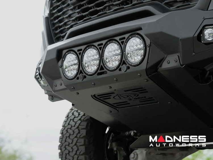 The Bomber's heavy-duty steel construction is complemented by a sophisticated satin black finish. The bumper's standout feature is its dedicated light pocket, crafted to accommodate three Baja Designs LP6 Round Lights. This setup is surrounded by satin black accent panels, offering an imposing yet sleek look. Whether you're navigating challenging terrains or cruising down the highway, visibility won't be an issue.