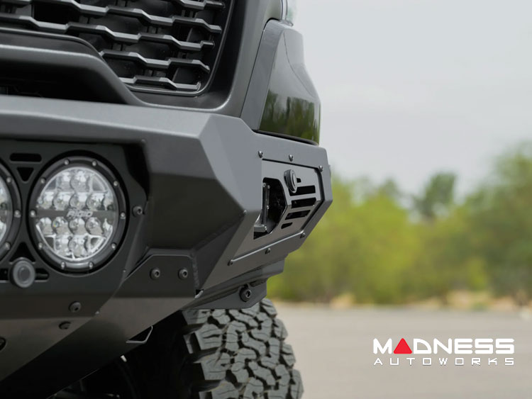 Proudly made in the USA from high-end American steel, the Bomber bumper exudes quality. Its dual-stage hammer black powder coat not only adds a layer of style but also protects against rust and corrosion, extending the lifespan of your investment. Choose the Bomber Front Bumper for a reliable, stylish upgrade that fully supports your truck’s advanced features.