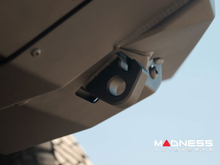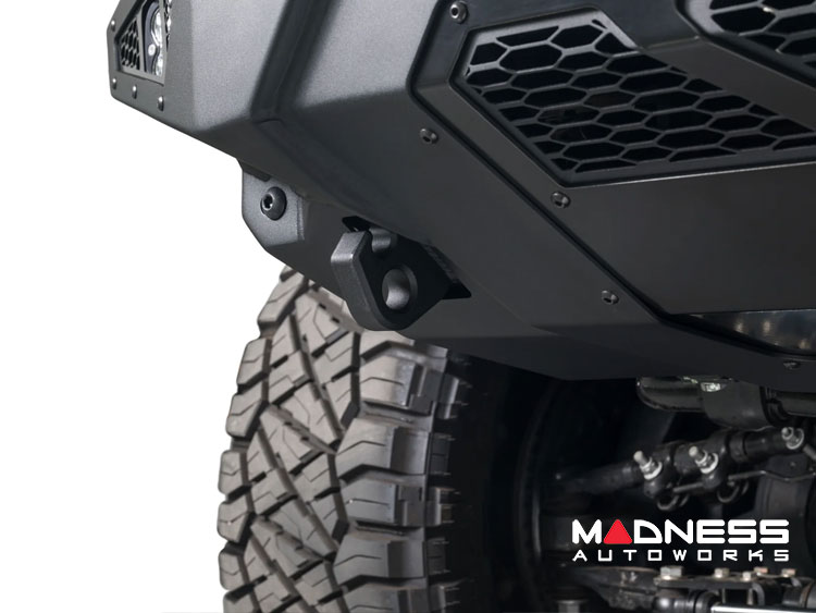 This front bumper stands out with its top hoop, designed to enhance your vehicle's lighting setup. It accommodates a 30-inch curved or straight light bar beneath the hoop, alongside a center mount for a 20-inch straight light bar, creating a perfect trio of lighting options. The bumper's wings are equipped with integrated pod light mounts, beautifully framed by detailed accent panels. Built from durable steel and finished with a dual-stage hammer black powder coat and satin black accent panels, it not only provides protection but also adds distinct styling to your truck. Additionally, vehicle recovery is made easier with two 1-inch thick D-ring mounts. The integrated heavy-duty front skid plate ensures that the undercarriage of your vehicle is well-protected. What’s more, the bumper retains factory parking sensors and drive assist features, so you won't need to compromise on existing functionality. It's important to note that our Adaptive Cruise Control Relocation Bracket is necessary to maintain ACC functions.