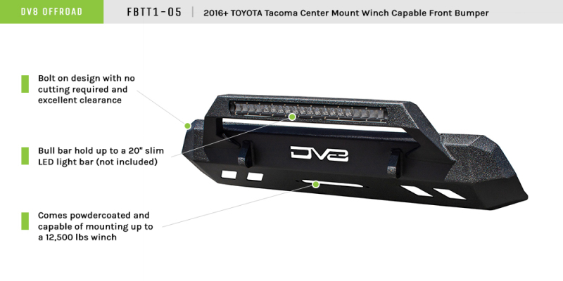 The Toyota Tacoma Front Bumper by DV8 Offroad is the perfect enhancement for your 2016 or newer Tacoma. This Center Mount Winch Capable Bumper is designed to provide superior functionality while maintaining the integrity of your vehicle's design.