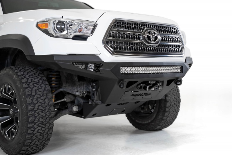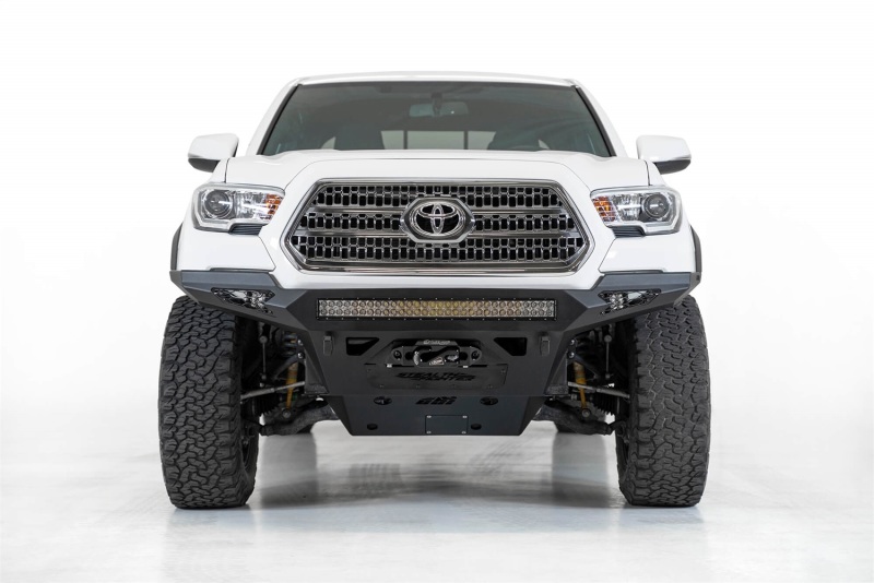 The Toyota Tacoma Front Bumper - Addictive Desert Designs - Stealth Fighter with Winch Mount - Hammer Black/Satin Black - '16-'19 is a standout accessory for your truck. Known for its sleek design and robust construction, it perfectly complements the Tacoma's factory design while offering enhanced protection.