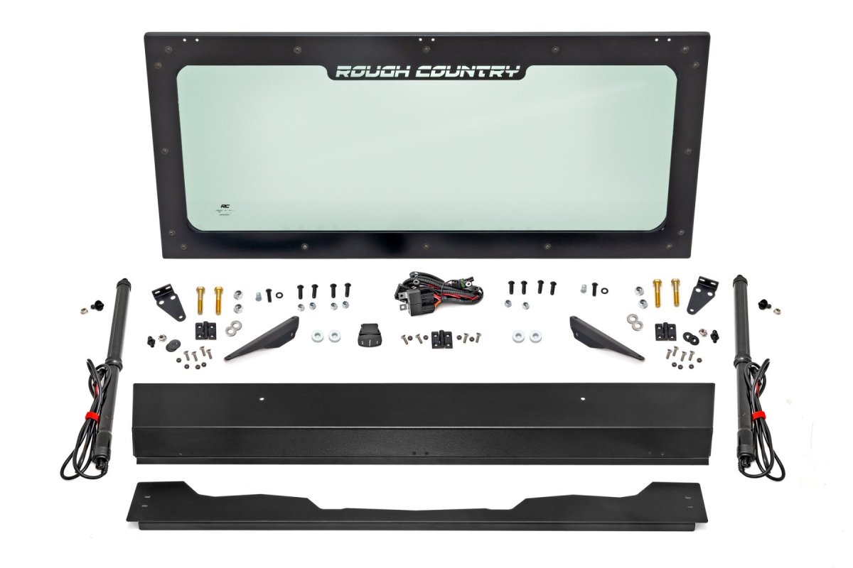 Rough Country's Auto-Tilt Glass Windshield offers exceptional strength with its DOT-approved glass, ensuring resilience against cracks and breakage, even when traversing rugged terrains. Built into a heavy-duty metal frame with UV and scratch-resistant powder coating, this windshield is engineered for endurance in all weather conditions. Enjoy peace of mind with the included weather seal protection, ensuring the longevity of your windshield's pristine condition for years to come. Whether you're on a slow-paced trek or a high-speed adventure, the push-button control with dual linear actuators offers unparalleled convenience, allowing you to adjust the windshield mid-ride. Open it slightly for minimal airflow or fully for maximum ventilation, all with the simple flick of a rocker switch.