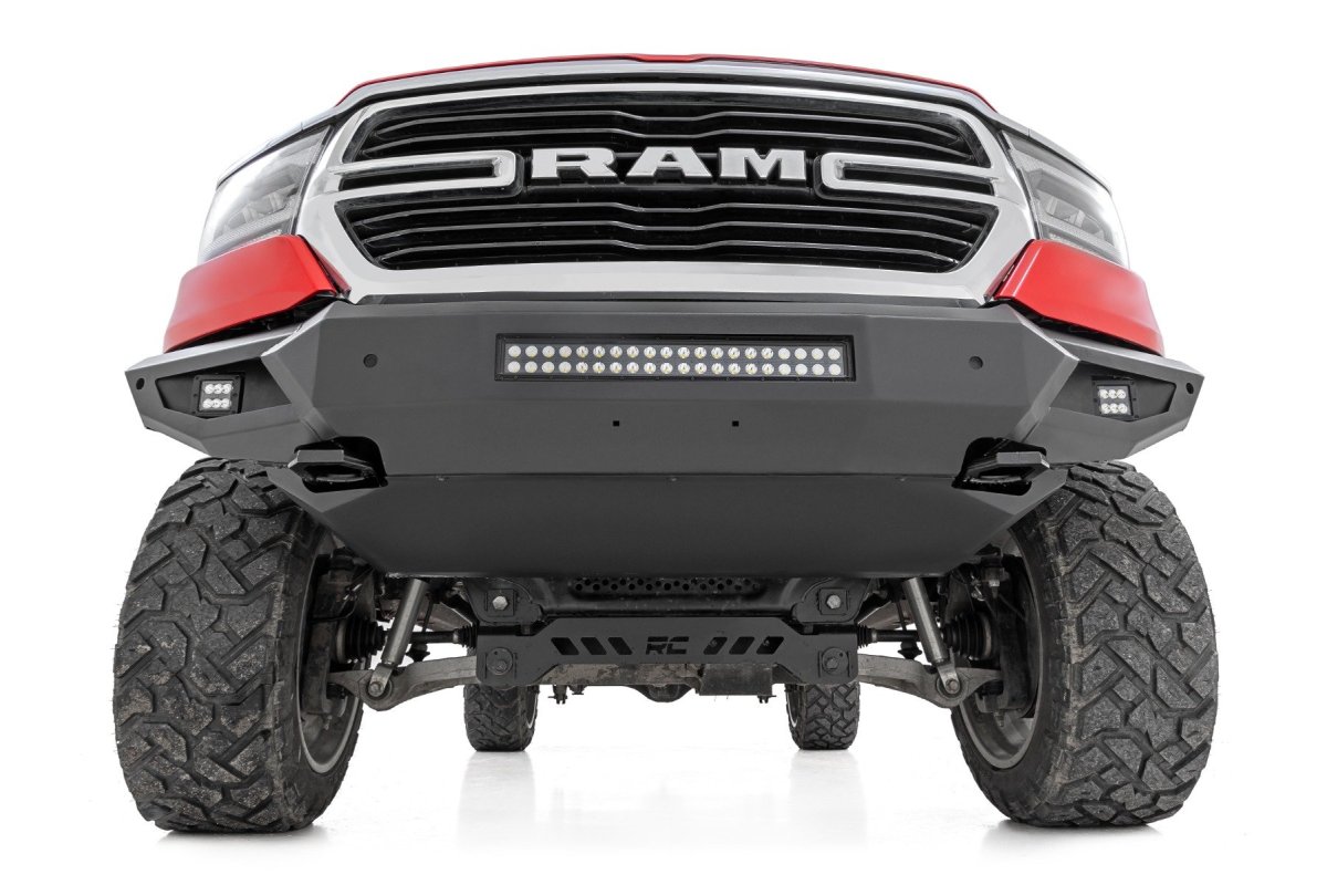 Ram 1500 Front Bumper - Rough Country - High Clearance LED with Skid Plate & Tow Hooks - Flat Black - '19-'24
