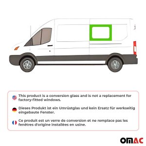 The Ford Transit Middle Side Fixed Glass - Left - Omac USA - Galaxy - 2015 is designed to perfectly fit your vehicle. This high-quality glass piece enhances the functionality and style of your Ford Transit, while ensuring durability and performance.