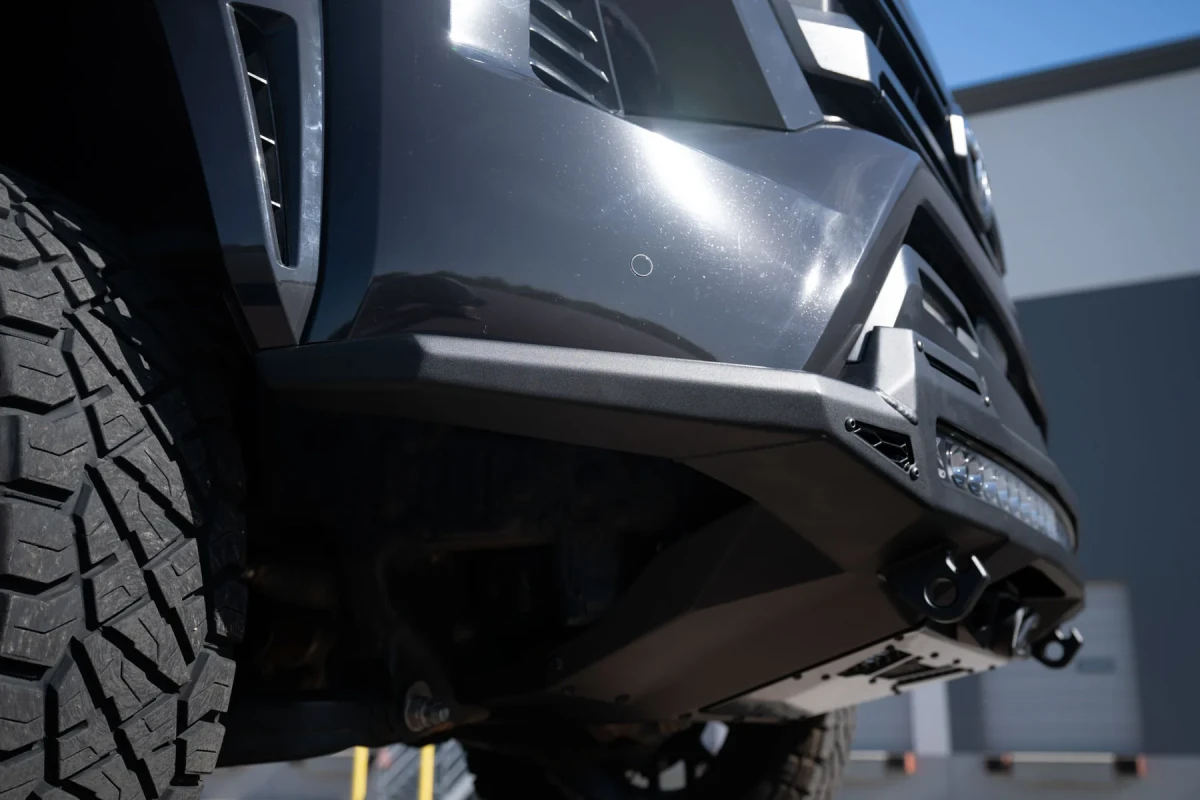 Also included are one-inch thick D-ring mounts that empower you with complete vehicle recovery capabilities, indispensable for off-road enthusiasts. Further safeguarding your Tacoma, the integrated front skid plate shields the front undercarriage from potential damage, whether you're navigating urban landscapes or rugged trails. Additionally, the bumper's durable steel construction is finished with a sophisticated dual-stage hammer black powder coat that not only enhances its look but also protects against harsh environments. Importantly, it retains all factory parking sensors and Toyota Safety Sense features, ensuring that your vehicle's advanced systems remain fully operational. Proudly made in the USA, this bumper is a testament to superior craftsmanship but please note, it is not compatible with Trailhunter or TRD Pro models.
