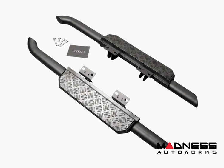 The Land Rover Defender D90 Side Steps - Checkered Pattern by Urban Automotive - Shadow Black are a robust addition to your vehicle, designed to ensure both functionality and style. Perfectly compatible with the new Defender, these fixed-mounted side steps offer a sleek profile and durable construction.