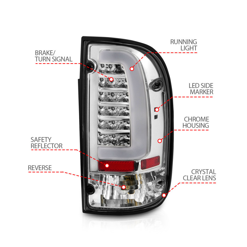 Transform the rear of your 1995-2000 Toyota Tacoma with ANZO's LED Taillights. This pair of LED taillights is designed with a sleek chrome housing and a clear lens, making them an ideal upgrade for Tacoma enthusiasts looking to enhance both function and style.ANZOUSA has over 35 years of professional manufacturing experience, delivering products that stand out in quality and innovative styling. These LED taillights are no exception, crafted to the highest standards and 100% street legal. The clear lens and chrome housing not only update the look of your Tacoma but also provide precise illumination, ensuring other drivers see you clearly in all conditions. Tailored for easy installation, these lights utilize stock mounting locations and hardware, meaning you can upgrade with common hand tools in no time. Each unit is rigorously tested for fit and function and adheres to D.O.T. and S.A.E. standards. Plus, ANZO offers a 1-year warranty covering any manufacturer's defects, so you can install with confidence.