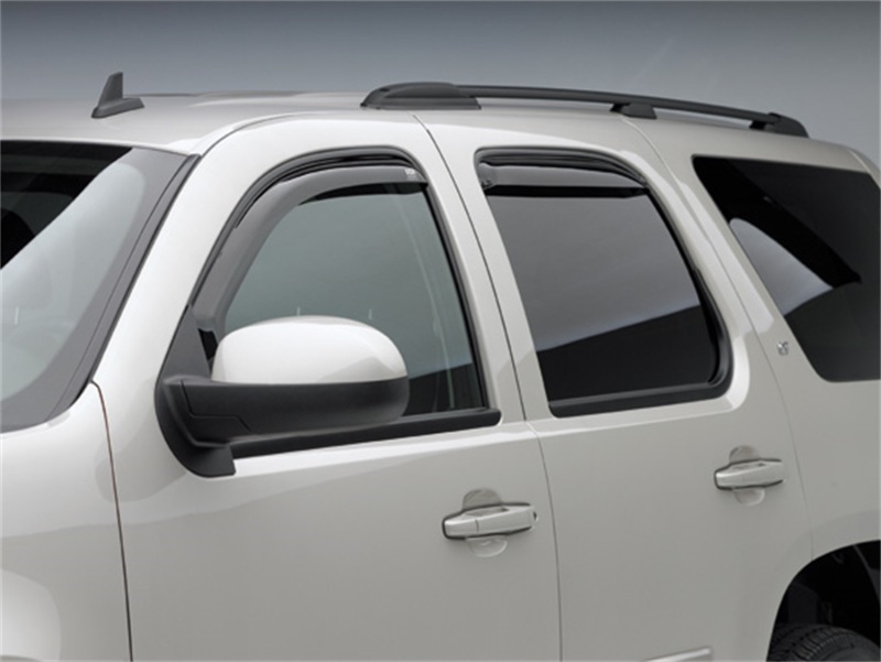 GMC Yukon Wind Deflectors - Front + Rear - EGR - In-Channel - Dark Smoke - 07-14 is a 4-piece set of EGR in-channel window visors made for 2007–2014 GMC Yukon (and Chevy Tahoe) 4-door models. These dark-smoke visors allow fresh air circulation while helping to keep rain and wind out.