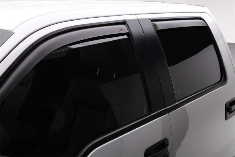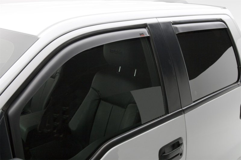 Ford Super Duty Window Visors - Front + Rear - EGR - In-Channel Style - Matte Black - `17-`24. These EGR in-channel visors provide smoked matte black protection for the front and rear side windows of 2017–2024 Ford Super Duty trucks, improving ventilation while keeping rain and road spray out.
