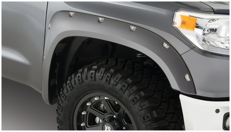With their recessed stainless steel bolts and massive presence, Pocket Style Fender Flares are a Bushwacker original and an off-road icon. They give you the hard-core look of bolt-on flares, with no body-side sheet metal drilling required. Pocket Style Fender Flares are custom-designed for your vehicle to complement oversized tires and high-clearance lift kits. You can mount them right out of the box with their tough, OEM-style matte black finish they're UV protected so they won't chalk. You can also paint them to match or accent the body color for a factory-custom look. Pocket Style Fender Flares are made from our thick, warp-resistant Dura-Flex 2000 material and tailor-made for added durability and flexibility on the trail. When you need maximum tire coverage with minimum time and effort, it's in the pocket. Pocket Style Fender Flares from Bushwacker.. Pocket Style® Fender Flares; 4 pc.; Front Tire Coverage 1.75 in.; Front Height 4.5 in.; Rear Tire Coverage 1.75 in; Rear Height 4.5 in.; Smooth Finish; Black;. Precision engineered for a perfect fit that provides the rugged look of bolted-on flares without drilling through the body. Precision Engineered For A Perfect Fit That Provides The Rugged Look Of Bolted-On Flares w/o Drilling Through The Body. Bushwacker 14-18 Toyota Tundra Fleetside Pocket Style Flares 4pc 66.7/78.7/97.6in Bed - Black. Installs easily with little to no drilling/trimming required -- all hardware is included. Installs Easily With Little To No Drilling/Trimming Required - All Hardware Is Included. Whether On-Road Or Off - Our Heavy-Duty Hardware Holds The Flares Securely In Place. Whether on-road or off, our heavy-duty hardware holds the flares securely in place. 100 Percent UV Protected Smooth Matte Black Smooth Finish Can Be Easily Painted. 100% UV protected smooth matte black smooth finish can be easily painted. Pocket/Rivet Style Fender Flares Black Smooth Finish 4-Piece Set. Made Of Durable - Yet Flexible Dura-Flex 2000 ABS Material. Made of durable, yet flexible Dura-Flex 2000 ABS material. Tire coverage varies with vehicle: 0.5 In.- 3 In.. Tire Coverage Varies With Vehicle 0.5 in.- 3 in.. Fender Flares Pocket Style 4Pc. Bushwacker FF Pocket Style 4Pc. Pocket Style® Fender Flares. Limited Lifetime Warranty. FF Pocket Style 4Pc. Fender Flare