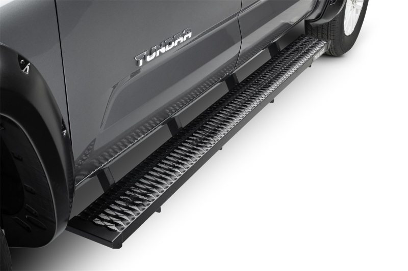 The Growler running board provides a clean yet aggressive look your vehicle. The Sure Grip tread design allows for ultimate traction in any condition. All aluminum construction with modular steel brackets offers long lasting durability and strength for all of your vehicle needs. Bolt-on brackets make installation quick and easy. This is a convenient option for work truck and fleet solutions.. Growler Step System - Cab Length (1 Step per Side) - 7 in. Board - 2007-2021 Toyota Tundra CrewMax - Textured Black. Growler Step System-Cab Length (1 Step per Side)-7 in. Board-2007-2021 Toyota Tundra CrewMax-Textured Black. N-Fab Growler Fleet 07-19 Toyota Tundra Crew Cab - Cab Length - Tex. Black. 7" Wide Aluminum board & end caps for long lasting durability. Aggressive Tread Design Allows For Traction In Any Condition. Growler - Cab Len - 07-21 Tundra CrewMax - TX Blk. Sold as a Kit with boards and brackets in one box. Growler-Cab Len-07-21 Tundra CrewMax-TX Blk. Bolt-on brackets for ease of installation. Available in Cab Length Configuration. 7 in. Wide Aluminum Sure Grip Board. Textured Black Powder Coat Finish. Growler Running Boards. Grwlr07-21TunCrwMxTX. Step Nerf Bar