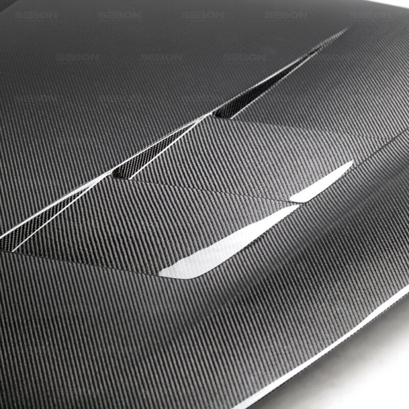 Seibon Carbon components are carefully hand-crafted using only the finest materials. Our production team offers superior craftsmanship with over 20 years of experience working with carbon fiber. Every component is constructed with a consistent weave pattern. Our production processes allows exceptional carbon/resin ratio, creating high product stiffness that also leads to extra strength. For a stunning finish, our products are coated with a glossy clear coat that does not chip or flake. We meticulously inspect all of our components and stand firmly behind our products so that you can enjoy peace of mind with every genuine Seibon Carbon product. Creating performance-oriented products that help shed unnecessary weight without sacrificing style is our specialty. Race after race, Seibon products have proven to be as strong as the driver's ambition to win, thus making Seibon Carbon the preferred brand among professional drivers.. All items are made to order and may require extra time to be manufactured. Hood pins required. Heatshield required. Do not use stock shocks and dampers.. Uses professional, high quality 3K 2X2 twill weave carbon fiber fabric.. TS-style carbon fiber hood for 2018-2020 Kia Stinger. Seibon 18-19 Kia Stinger TS Carbon Fiber Hood. Show-ready. No painting required.. Reuses OEM install hardware. Promotes heat extraction. Durable and lightweight. Seibon Hood. Hood