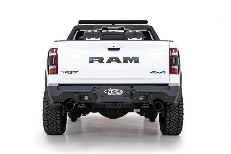 The Stealth Fighter Rear Bumper has a modern plate steel design that provides an aggressive look without being bulky. Clean lines and angles compliment the factory bodylines to give it a low-profile feel. Two rear facing cube light mounts are featured behind the panels. Parking sensor cutouts and trailer plug accommodations ensure that every OEM feature is retained. Reinforced clevis mounts provide a mounting point for 3/4 in. D-Rings, and the OEM bed step and tow hooks also remain fully functional. Cutouts along the bottom of the bumper give room to keep the factory dual exhaust. As always, this product is fully bolt-on and made in America.. The Stealth Fighter Rear Bumper has a modern plate steel design that provides an aggressive look without being bulky. Clean lines and angles compliment the factory bodylines to give it a low-profile feel. Two rear facing cube light mounts are featured behind the panels. Parking sensor cutouts and trailer plug accommodations ensure that every OEM feature is retained. Reinforced clevis mounts provide a mounting point for 3/4" D-Rings, and the OEM bed step and tow hooks also remain fully functional. Cutouts along the bottom of the bumper give room to keep the factory dual exhaust. As always, this product is fully bolt-on and made in America.. RAM 1500 TRX Stealth Fighter Rear Bumper with D-Rings With 2 Rigid Duallies in Hammer Black with Satin Black panels. Hammer black powder coat finish; Satin black powder coat panel finish; Mounts for cube lights;. Addictive Desert Designs 2021 Dodge RAM 1500 TRX Stealth Fighter Rear Bumper - Hammer Black. Stealth Fighter Rear Bumper; Hammer Black; Panel Color Satin Black; Mounts For Cube Lights;. Satin Black Powder Coat Panel Finish. Addictive Desert Designs - Bumpers. Hammer Black Powder Coat Finish. Mounts For Cube Lights On Sides. Stealth Fighter Rear Bumper. Bumper- Rear. Bumpers. Bumper