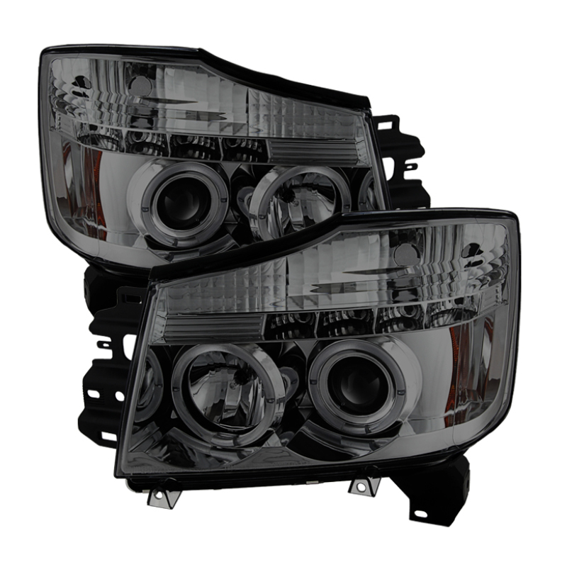 These projector headlights are designed to improve looks and visibility for your vehicle. They are made by OEM approved and ISO certified manufacturers. They are made with OEM standard quality and are designed for stock lights direct replacement.. Spyder Nissan Titan 04-14/Armada 04-07 Projector Headlights LED Halo LED Smke PRO-YD-NTI04-HL-SM. Halo LED Projector Headlights; Uses T10 LED Ultra White LED Bulb; Pair; Smoke;. (Spyder Signature) Projector Headlights - LED Halo - Smoke. Designed For Use With Aftermarket Or Stock Bulbs. Projector Headlights - LED Halo - Smoke. Made For Direct Plug-And-Play Fitment. Features halogen low and high beam. Halo LED Projector Headlights. 5033963, Projector Headlights. OEM Specific Quality. Projector Headlights. Head Light Set. Headlight Set
