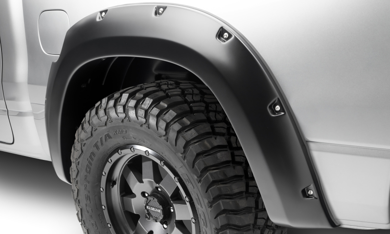 With their recessed stainless steel bolts and massive presence, Pocket Style Fender Flares are a Bushwacker original and an off-road icon. They give you the hard-core look of bolt-on flares, with no body-side sheet metal drilling required. Pocket Style Fender Flares are custom-designed for your vehicle to complement oversized tires and high-clearance lift kits. You can mount them right out of the box with their tough, OEM-style matte black finish they're UV protected so they won't chalk. You can also paint them to match or accent the body color for a factory-custom look. Pocket Style Fender Flares are made from our thick, warp-resistant Dura-Flex 2000 material and tailor-made for added durability and flexibility on the trail. When you need maximum tire coverage with minimum time and effort, it's in the pocket. Pocket Style Fender Flares from Bushwacker.. Precision engineered for a perfect fit that provides the rugged look of bolted-on flares without drilling through the body. Precision Engineered For A Perfect Fit That Provides The Rugged Look Of Bolted-On Flares w/o Drilling Through The Body. Pocket Style® Fender Flares; 2 pc.; Rear Tire Coverage 2.6 in.; Rear Height 5.95 in.; Smooth Finish; Black;. Installs easily with little to no drilling/trimming required -- all hardware is included. Installs Easily With Little To No Drilling/Trimming Required - All Hardware Is Included. Whether On-Road Or Off - Our Heavy-Duty Hardware Holds The Flares Securely In Place. Whether on-road or off, our heavy-duty hardware holds the flares securely in place. 100 Percent UV Protected Smooth Matte Black Smooth Finish Can Be Easily Painted. 100% UV protected smooth matte black smooth finish can be easily painted. Bushwacker 19-22 Dodge Ram 1500 Pocket Style Rear Flares 2pc - Black. Pocket/Rivet Style Fender Flares Black Smooth Finish 2-Piece Rear. Made Of Durable - Yet Flexible Dura-Flex 2000 ABS Material. Made of durable, yet flexible Dura-Flex 2000 ABS material. Tire coverage varies with vehicle: 0.5 In.- 3 In.. Tire Coverage Varies With Vehicle 0.5 in.- 3 in.. Fender Flares Pocket Style 2Pc Rear. Bushwacker FF Pocket Style 2Pc Rear. Pocket Style® Fender Flares. Limited Lifetime Warranty. FF Pocket Style 2Pc. Fender Flare