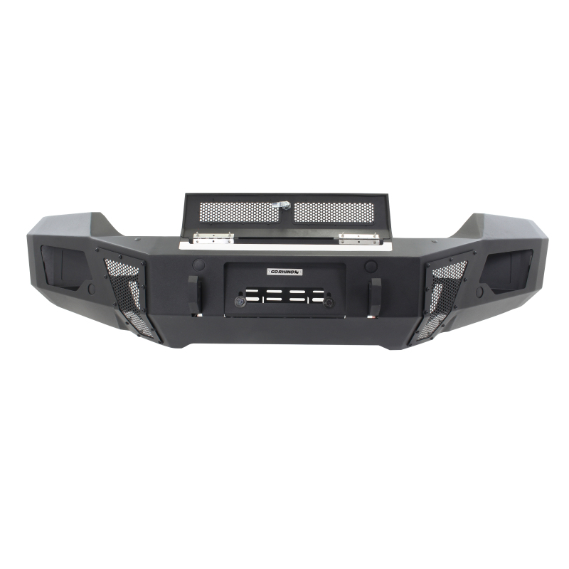 Part of Go Rhino's famous BR Bumper family. The BR6 winch-ready HD Front Bumper Replacement offers heavy duty front end protection while upgrading your vehicle's factory appearance with an aggressive, modern look. The unique design includes integrated light ports, while optional light plates. and patented Light Mount Bar allows for additional customization. It's not all just good looks - the BR6's sturdy, 1/4" steel winch plate can accommodate winches rated up to 12,500 pounds and the patented Rhino Hook shackles mounts are attached directly to frame rails for extra strength. BR6 Bumpers come with a Limited Lifetime warranty on materials and construction and a 5 year warranty on the Textured Black Finish.. Holds winches rated to 12,500 lbs. with pre drilled slots and holes for many popular winch brands. Go Rhino 2019 Chevrolet Silverado 1500 LD (Classic) BR6 Front Bumper Replacement. Hinged winch cover for easy access - cover can be used with or without a winch. Easy Installation with 2-piece design for easy handling, no drilling required. Optional 3" x 3" lights plates, light bar mount and lights sold separately. Patented heavy-duty Rhino hook D-ring shackle mounts (US Patent # 790,408). Winch-ready Front Bumper is designed to fit the contours of each vehicle. Strong steel replacement bumper protects winch and vehicle. BR6 Winch-Ready Front Bumper for Chevrolet Silverado 1500. Winch tray and mounting brackets are made from 1/4" steel. Integrated hidden front-facing 2" hitch receiver mount. BR6 Winch-ready Front Bumper. No drilling required. BR Bumper BR6 Front. Bumper