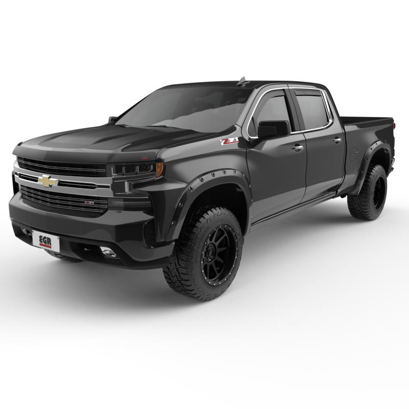 EGR Fender Flares are manufactured to OEM Quality, and are robotically trimmed to give you the most precise fitment in the industry. Made from raw, virgin material, you know you're only getting the good stuff here at EGR. All EGR Fender Flares feature an easy, no-drill installation process; which will have you showing off your truck in no time. Don't get faded with the other guy's; EGR Fender Flares all feature a UV protectant film that will keep your flares looking new for years to come. When it comes to EGR, Premium Quality would be an understatement, it's the Standard!. EGR Bolt-On Look Color Match Fender Flares feature OEM quality, no drill installation, making them the perfect DIY upgrade for your vehicle. The color matched Fender Flares increase tire coverage of your fenders by up to 2 inches. EGR Color Match Fender Flares feature preinstalled protective rubber trim and stainless finished decorative bolts for a hassle free installation.. EGR Traditional Bolt-On Look Paint to Code Fender Flares feature OEM quality, and a no drill installation, making them the perfect DIY upgrade for your vehicle. The Paint to Code Fender Flares can increase tire coverage of your fenders by up to 2 inches. EGR Paint to Code Fender Flares feature a hassle-free installation, so you can focus on more of what you want to do.. 791694-GBA-EGR Color Infused Acrylic S/S Bolt On Look Fender Flares for 2019-2024 Chevrolet Silverado 1500 (ALL Beds). EGR 19-22 Chevrolet Silverado 1500 Traditional Bolt-On Look Fender Flares Black Set Of 4. EGR Color Match Style Black Fender Flare (OEM Color Code: GBA)-proudly made in the USA.. 791694-GBA-Bolt-On Fender Flares for 2019-2024 Chevrolet Silverado 1500. EGR Paint to Code Black Fender Flare (OEM Color Code: GBA) . EGR bolt-on look fender flare set-Paint to Code. EGR bolt-on look fender flare set-Color Match. EGR - 791694-GBA - BOLTON FF PAINT TO CD. 791694-GBA-Fender Flares Silverado 1500. Robotically trimmed for precise fitment. Guaranteed To Match The Factory Color. EGR-791694-GBA-BOLTON FF COLOR MTCH. BOLTON FF COLOR MTCH. 791694-GBA-FF Chevy. BOLTON FF PAINTED. Fender Flare