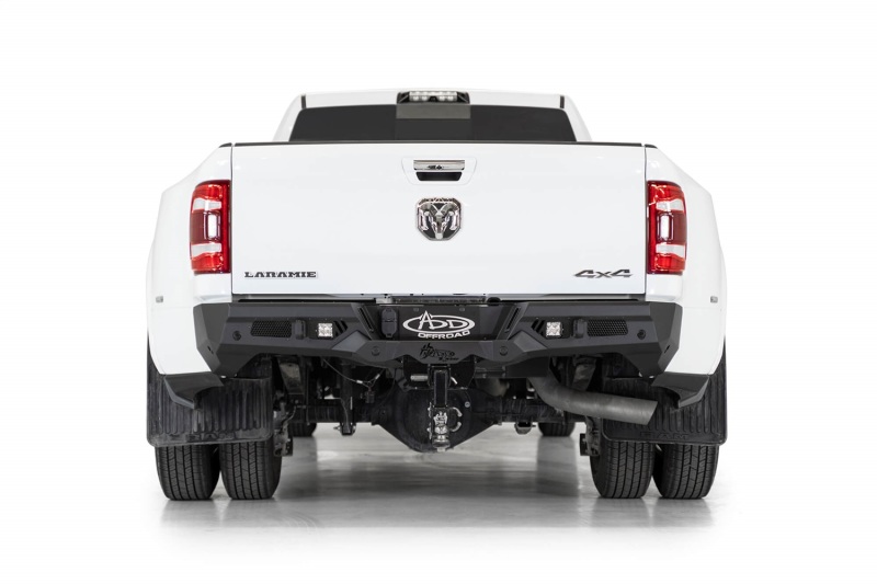Heavy duty trucks call for heavy duty bumpers. The RAM 2500/3500 Bomber HD rear bumper takes the rugged plate steel design from the front bumper and brings it to the rear of the truck. Our reinforced clevis mounts provide a mounting point for 3/4 in. D-Rings for added utility. Lighting options include two rear facing cube lights mounts. OEM parking sensors are retained. As always, this product is fully bolt-on and made in America.. Heavy duty trucks call for heavy duty bumpers. The RAM 2500/3500 Bomber HD rear bumper takes the rugged plate steel design from the front bumper and brings it to the rear of the truck. Our reinforced clevis mounts provide a mounting point for 3/4" D-Rings for added utility. Lighting options include two rear facing cube lights mounts. OEM parking sensors are retained. As always, this product is fully bolt-on and made in America.. Dodge 2500/3500 Bomber HD Rear Bumper with SENSOR MOUNTS set up for Duallys in Hammer Black with Satin Black panels. Sensor cutouts; Hammer black powder coat finish; Satin black powder coat panel finish; Mounts for cube lights;. Addictive Desert Designs 19-20 Ram 2500/3500 Bomber HD Rear Bumper w/ Sensor Mounts. Bomber HD Rear Bumper; Hammer Black; w/Backup Sensor Cutouts;. Satin Black Powder Coat Panel Finish. Addictive Desert Designs - Bumpers. Hammer Black Powder Coat Finish. Mounts For Cube Lights. Bomber HD Rear Bumper. Backup Sensor Cutouts. Bumper- Rear. Bumpers. Bumper