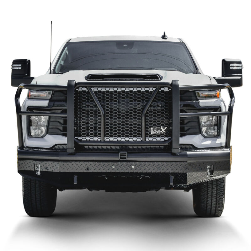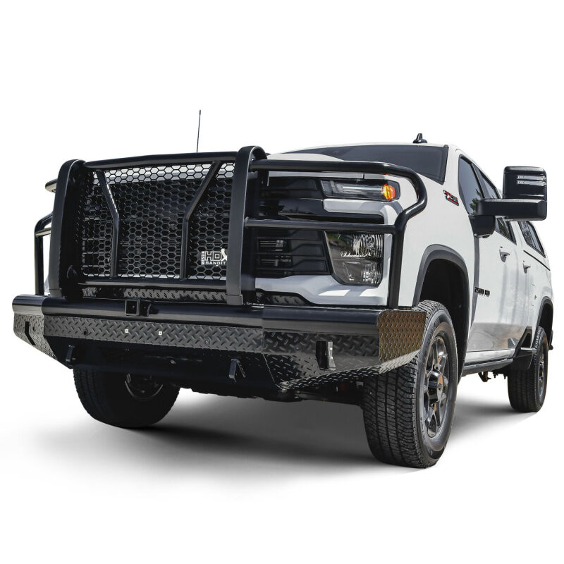 Westins HDX Bandit Bumper combines a heavy duty diamond plate steel bumper constructed of schedule 40 steel pipe with a stylish grille guard featuring 2in. diameter outer wraparound wings and 2 3/4in. wide upright rubber strips. Designed to protect headlights, grille, hood and front fenders from road hazards, debris and wildlife damage. Features a stylish metal honeycomb mesh screen, which allows maximum airflow to the intercooler or radiator area while accenting the front end styling with a clean and rugged look. Removable mesh screens allow for factory camera and adaptive cruise control options available on some late model Ford applications. HDX Bandit Bumper includes a built-in 2in. receiver hitch and (2) heavy duty 9,500 lbs bow shackle mounts, capable of delivering multiple towing options. Compatible for factory fog lamps or LED post mount lights. In addition, some late model Ram and Chevrolet applications feature provisions for factory parking sensors. Bolt-on installation with hardware and mounting brackets included. Available in black powder coat finish.. Metal mesh screen allows maximum air flow to intercooler or radiator area. Has provisions for factory parking sensors (late model Chevrolet and Ram). Removable mesh screen for adaptive cruise control (late model Ford only). Removable center mesh for factory camera option (late model Ford only). Westin 2025 Chevrolet Silverado 2500/3500 HDX Bandit Front Bumper. Protects vehicle from damage against wildlife and road debris. Compatible for factory fog lamps or LED post mount lights. Designed and engineered in San Dimas California USA. 2" tube full wraparound wings ties into bumper. Heavy duty 2 3/4" wide upright rubber strips. Provides added safety to driver and vehicle. (2) heavy duty 9,500 lbs bow shackle mounts. Bolt-on installation - no drilling required. HDX Bandit Front Bumper; Textured Black;. Hardware and mounting brackets included. Constructed of schedule 40 steel pipe. Mounting provisions for license plate. 15/16" diameter shackle mount hole. Custom die-cast riveted logo badge. Includes Installation Instructions. 1 1/2" headlight protection tubes. Heavy duty diamond plate steel. Honeycomb mesh protects grille. Built-in 2" receiver hitch. HDX Bandit Front Bumper. Textured Black. Front Bumper. Bumper