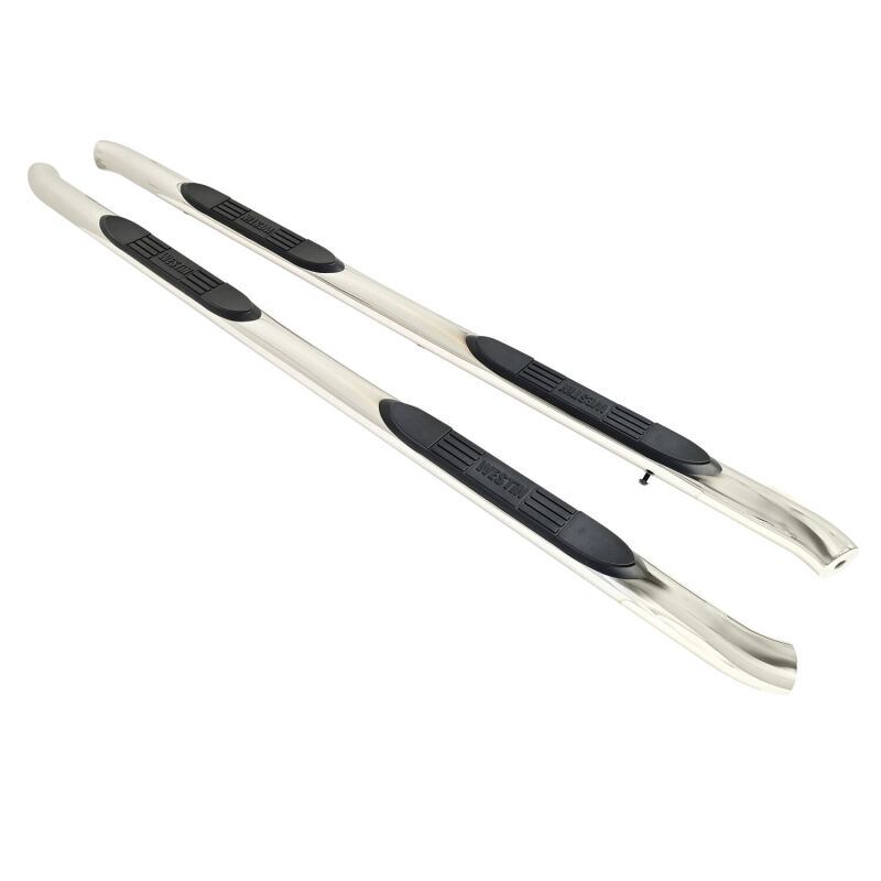 These Westin E-Series 3 nerf bars use stainless steel tubing with a recessed injection-molded polymer step pad that displays the Westin name and is UV resistant. The E-Series design features a recessed area-mounted step pad unique to this line, and step design and mounting technique varies by application. The kit is vehicle specific and includes the mount kit and hardware; on most applications the bars bolt on without drilling. The 3" tube diameter offers solid step support and helps protect the vehicle rocker panels from potential damage and trail debris — a practical choice for enthusiasts seeking durable, functional upgrades.