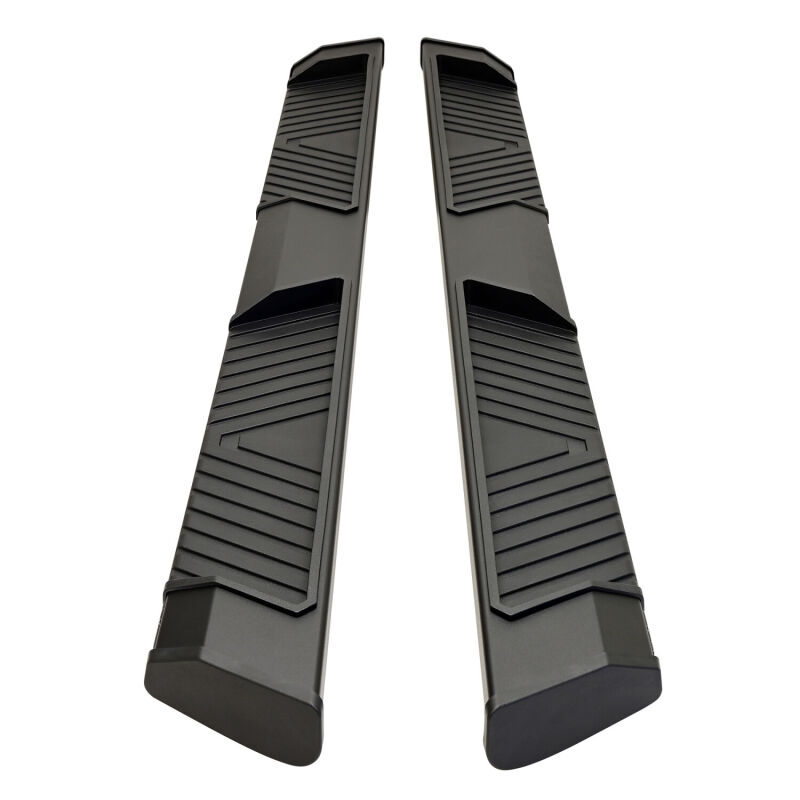 The AT6 design uses extruded aluminum with a textured black powder-coated finish for corrosion resistance and a rugged look; a polished stainless steel option is available for maximum corrosion protection. These boards are lightweight yet structurally durable, include bracket covers and rounded end caps for a factory appearance, and are engineered to bolt on with included hardware—no drilling required. Installation typically takes about 1.5 hours and does not usually require a lift. The footboard layout places pads ergonomically for comfort and maximum traction, making them a practical upgrade for daily use or heavy-duty work environments.