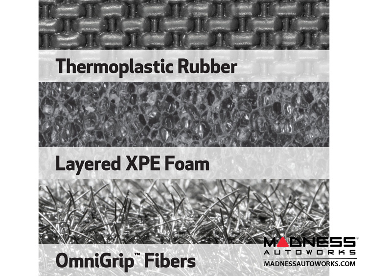 The solid protection offered by StyleGuard XD® floor liners begins with their unique base layer. The underside is covered with thousands of patented OmniGrip® fibers -- bristling, wire-like threads that anchor deep into all types of carpet and lock the floor liners in place. Instead of three or four posts or even an array of plastic nubs like some custom fit floor mats, OmniGrip® literally provides thousands of anchoring points to keep the floor liners from shifting or moving once in place.