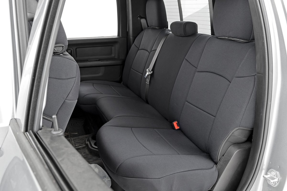 The Ram 2500 Seat Covers - Front + Rear - Rough Country - Neoprene - '19-'23 are a practical and effective way to protect the seats of your vehicle while maintaining a fresh interior. These high-quality seat covers are designed specifically for Ram 2500 models from 2019 to 2023, offering both front and rear seat protection.