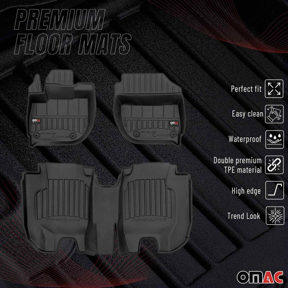 Crafted from high-quality Thermoplastic Elastomer (TPE), these mats offer exceptional durability and resilience against daily wear and tear while remaining environmentally friendly. Their robust construction ensures that they can withstand extreme weather conditions, making them suitable for all seasons. These floor mats are engineered to trap dirt, mud, snow, and liquids, protecting your vehicle's interior and ensuring it stays clean and fresh. With an anti-slip bottom layer, these mats stay securely in place, providing safety and peace of mind during your drives.