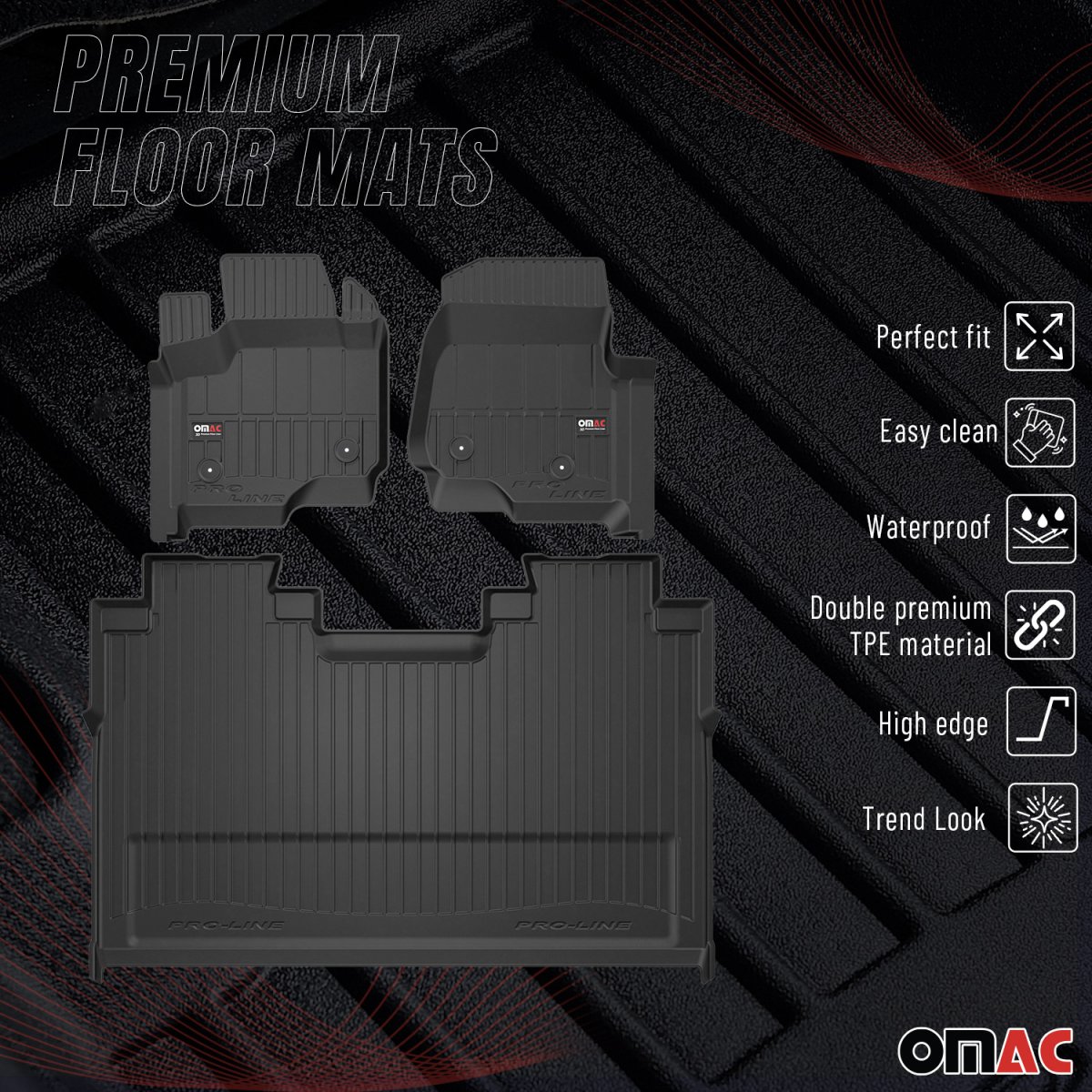 Introducing the Ford F250 Floor Mat - Omac USA - Proline Premium TPE 3 Pcs - Black - '17-'22, the perfect blend of protection and style for your truck’s interior, designed to fit models from 2017 to 2022. These durable mats offer precise coverage and a tailored fit to keep your vehicle's floors looking pristine.