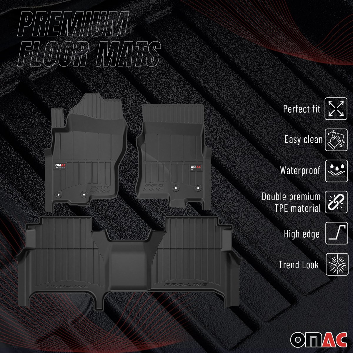 These floor mats are engineered for durability and resilience. The Proline Premium TPE material is not only highly durable but also eco-friendly, ensuring that your vehicle's flooring is safeguarded against dirt, spills, and wear while being conscious of environmental impact. The textured surface enhances traction, effectively trapping liquids and debris while being resistant to common chemicals and abrasions. Engineered to withstand extreme temperatures, these mats maintain their flexibility and form, ensuring reliable performance in all weather conditions.