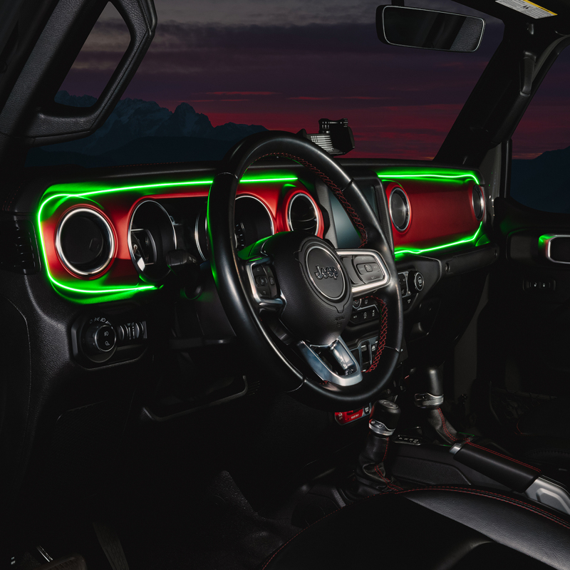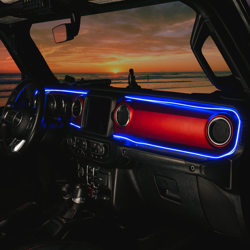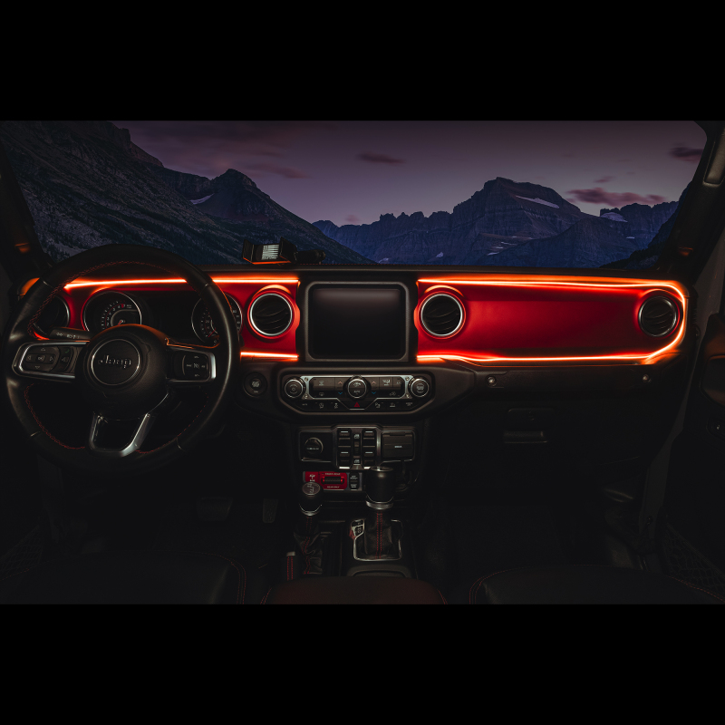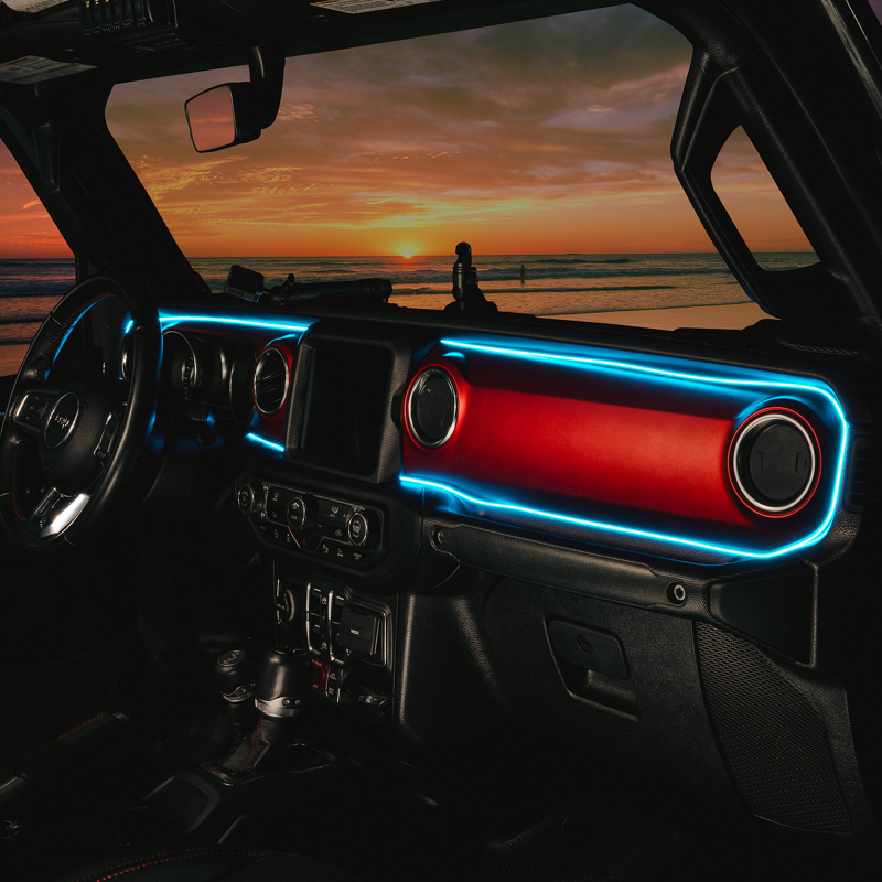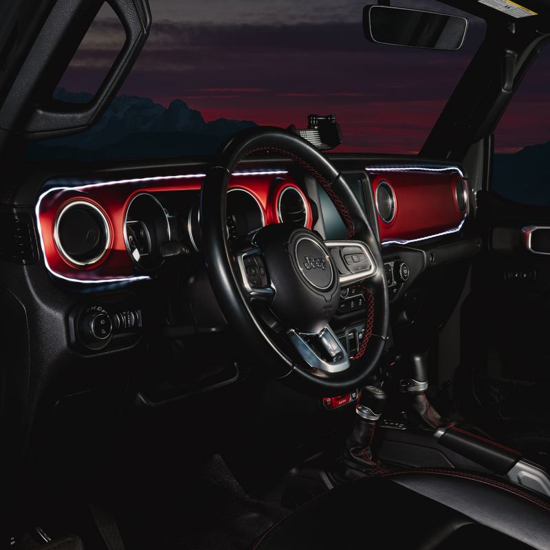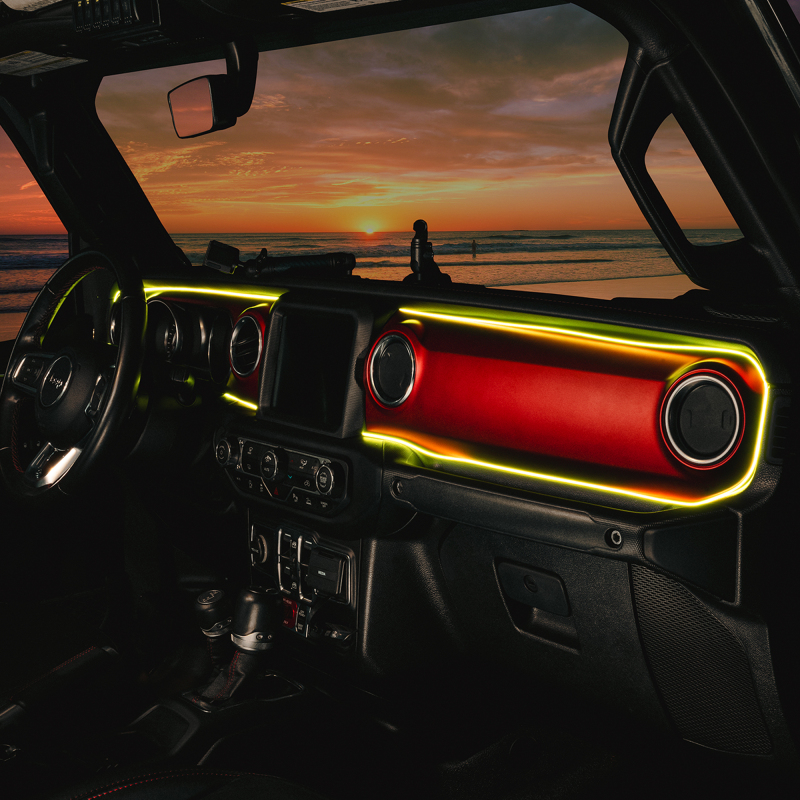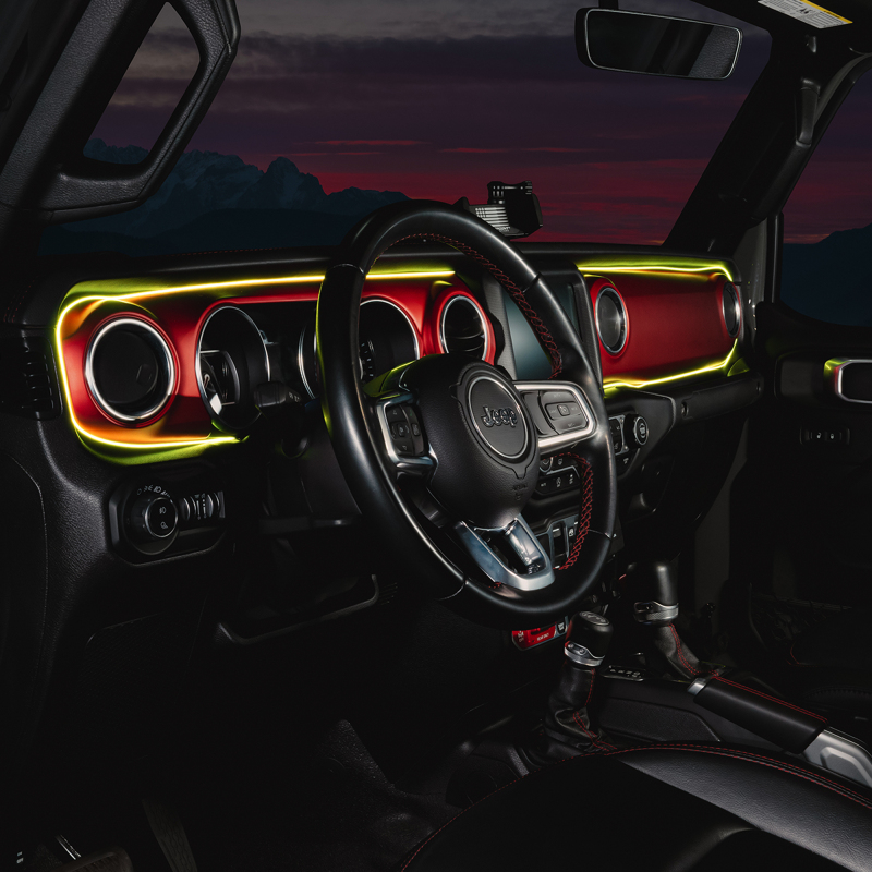 simply connect to a USB power source and start customizing. With ORACLE’s advanced Dynamic ColorSHIFT® technology, you get more than just solid colors. Choose from pre-programmed moving patterns, static color modes (including pure white), and even create your own personalized lighting effects with full pixel editing in the free Lotus LAMP app. Adjust color, speed, brightness, and color transitions to match your mood, style, or driving experience. Control your lighting easily using either the included wireless remote or the smartphone app. Whether you want subtle accent lighting or a dynamic, show-stopping display, the ORACLE Dash Kit delivers unmatched versatility and modern style.. Transform your Jeep’s Interior with Fully Dynamic LED Dash Lighting! Bring your 2018-2023 Jeep Wrangler JL’s or 2020-2023 Jeep Gladiator JT cabin to life with the ORACLE Lighting Dynamic ColorSHIFT® LED Dash Strip Kit. Designed to perfectly complement the rugged yet modern Jeep interior, this premium lighting upgrade adds immersive, customizable lighting with no complicated wiring or permanent modifications required. The ultra-slim, flexible LED strips conform seamlessly to the Jeep’s dash contours, delivering a clean, factory-installed look. Installation is effortless. In the Box: (2) Dynamic ColorSHIFT® RGB LED Dash Strips, (1) USB Connection Hub, (1) Wireless Remote, (1) Installation Tool, (1) Roll of 3M Double Sided Adhesive. Custom Pixel Editing: Create your own dynamic color patterns with adjustable speed, brightness, color transitions, and blending in the Lotus LAMP app. Easy Installation: Includes everything needed: LED strips, controller, 3M adhesive mounting tape, USB power cable, installation tool, and remote. Flexible, Low-Profile Design: Ultra-slim LED strips conform perfectly to Jeep’s dash contours for a seamless factory-style fit. Product Specs: Diameter: 2mm, Lifetime: 20,000 hours of use, Material: Polymer, Voltage: USB 5V, Warranty: 1 Year. Dynamic ColorSHIFT® Technology: Pre-programmed moving patterns, static color modes, and pure white option. ORACLE Lighting 2018-2023 Jeep Wrangler JL/Gladiator JT Dynamic ColorSHIFT LED Interior Dash Board Kit. Dual Control Options: Wireless handheld remote or smartphone control via the free Lotus LAMP app. Simple USB Power: Plug-and-play connection to your vehicle’s USB port—no hardwiring required. Oracle 18-23 Jeep Wrangler JL/Gladiator JT Dynamic ColorSHIFT LED Interior Dash Board Kit. Adjustable Brightness & Speed: Fine-tune lighting output to suit your mood or environment. 2018-2023 Jeep Wrangler JL/Gladiator JT Dynamic ColorSHIFT LED Dash Board Kit. Dash Fiber Optic Light Strip. JEEP-FIB-DASH-RGB-KIT-DC. ColorSHIFT Dynamic. Fiber Optic Kit