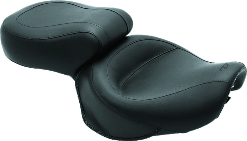 A deep front bucket measures 15" wide and keeps the driver from sliding back while offering good lumbar support. The passenger seat extends forward to provide additional back support for the driver, is 12" wide and features Mustang's unique internal steel support wings to keep the entire width of the molded foam supported. All styles are finished with braided edge trim.. Mustang 00-08 Honda VT1100 Sabre,97-08 Spirit,87-97 Shadow,95-01 Ace Touring 1PC Seat - Black. Wide Touring One-Piece Seat, Original