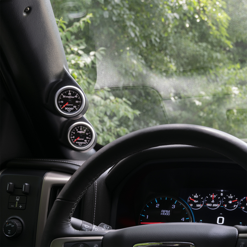 auto meter; autometer; gauge pillar; single; dual; triple; quad; gage; 52mm; 2 1/16" ; 2-1/16" ; pod; mount; cup. Black textured finish which can be painted to match your interior if desired. Professional fit and finish, no modification of factory trim piece required. High quality, composite construction is incredibly durable and looks great. GAUGE MOUNT, A-PILLAR, REPALCEMENT, DUAL, 2 1/16", SILVERADO/SIERRA 14+. Optimally Positions Key Performance Data Within Drivers Field Of Vision. Seamlessly integrate AutoMeter 2-1/16" gauges into your interior. Autometer 2-1/16in Dual Pillar 14-15 Chevy Full Size (Gen 3). Full dual 2-1/16" gauge pillar, black. No handle.. 2-1/16" DUAL PLLR, CHEVY, '14-15 (GEN 3). 2-1/16" DUAL PILLAR,. MOUNTING SOLUTIONS. Gauge Pod