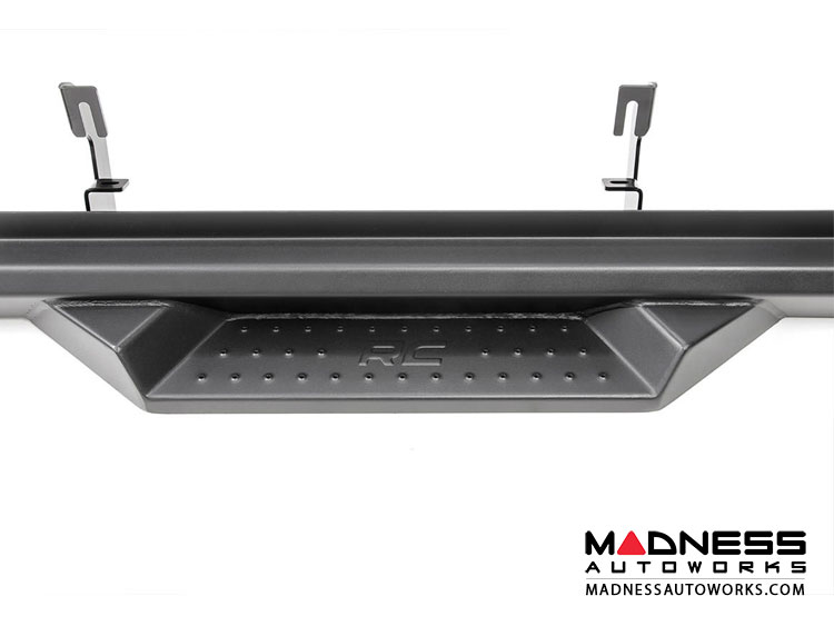These steel steps offer unrelenting reliability, powdercoated black to resist corrosion for a long life of great looks.Each step features a set of mounting brackets with a half-inch of adjustability to allow you to mount them closer or further from the body for the look and accessibility you prefer. Rough Country Steps include a Lifetime Replacement Warranty!