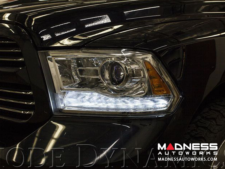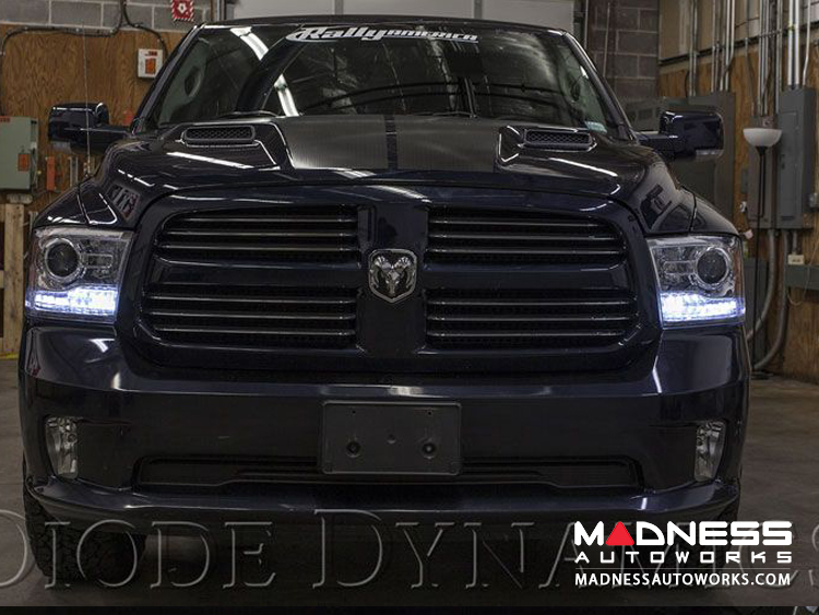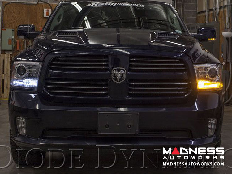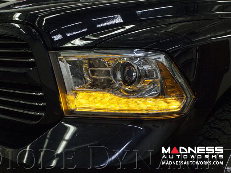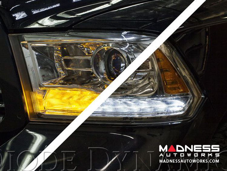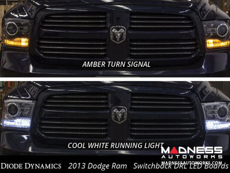 From the factory, the 2013+ Dodge Ram has LED accents in the headlight that illuminate in amber color, for the parking light and the turn signal. With Diode Dynamics replacement LED boards, you can upgrade your look by making those accents light up a brilliant white LED as well, with a "switchback" white and amber dual-color effect.