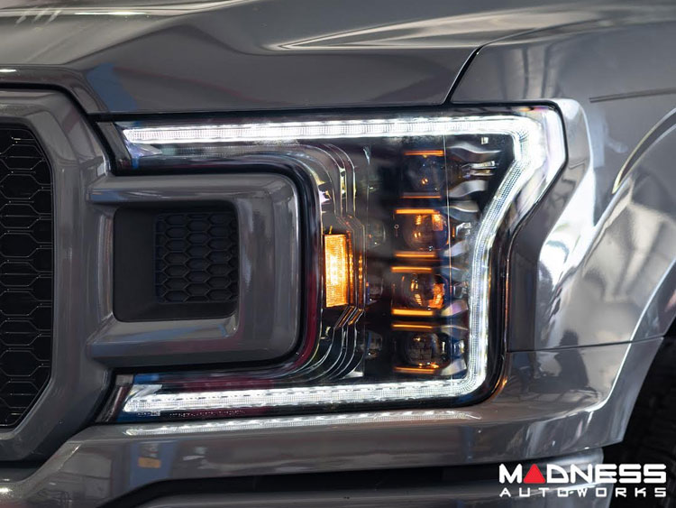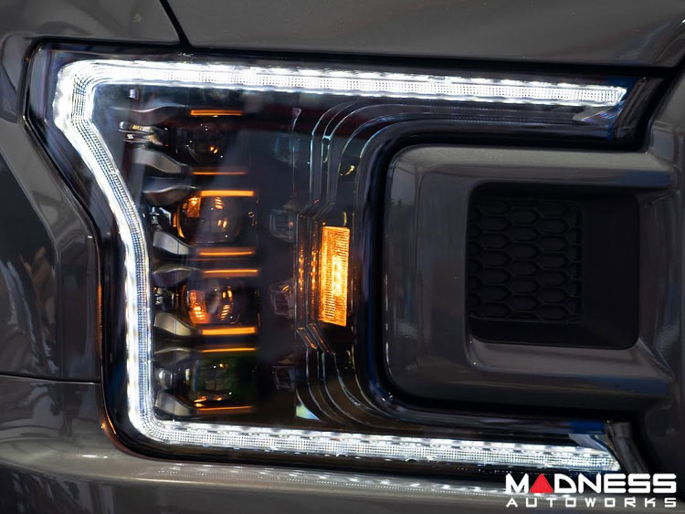 Superior Illumination. Employing a projector lens design with a quad LED setup, these Morimoto Headlights will light up the road ahead with a bright focused beam for better nighttime visibility. The stylish white LED Daytime Running Light (DRL) accents ensure that you are visible day or night by distracted drivers. While the amber LED sequential turn signal indicators bring an updated look to your F-150.
