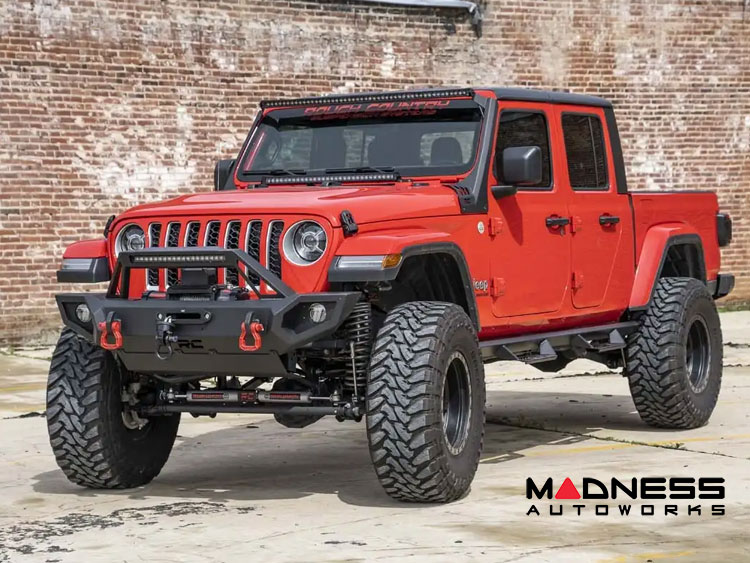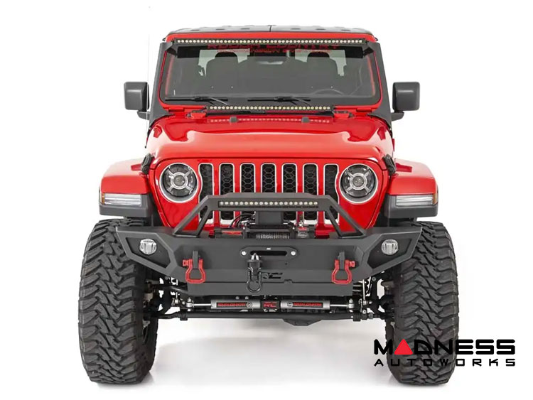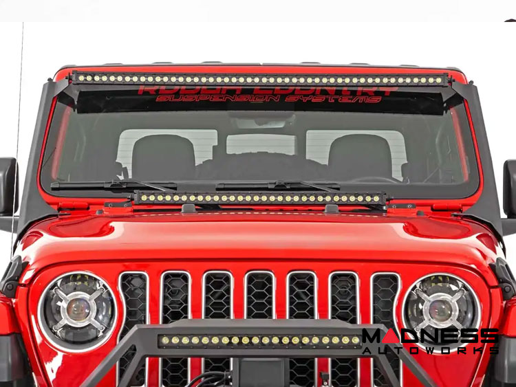 COMMAND THE DARK with Rough Country’s 50-inch LED Upper Windshield Light Bar Kit for your Jeep Wrangler JL. This easy-to-install kit is the ultimate lighting upgrade, combining style and functionality to elevate your off-roading experience. Designed for forward-facing visibility, this mount securely holds a 50-inch LED light bar between the top of your Wrangler's windshield and roof, giving your vehicle an aggressive and commanding look while spanning the entire width of your roof.