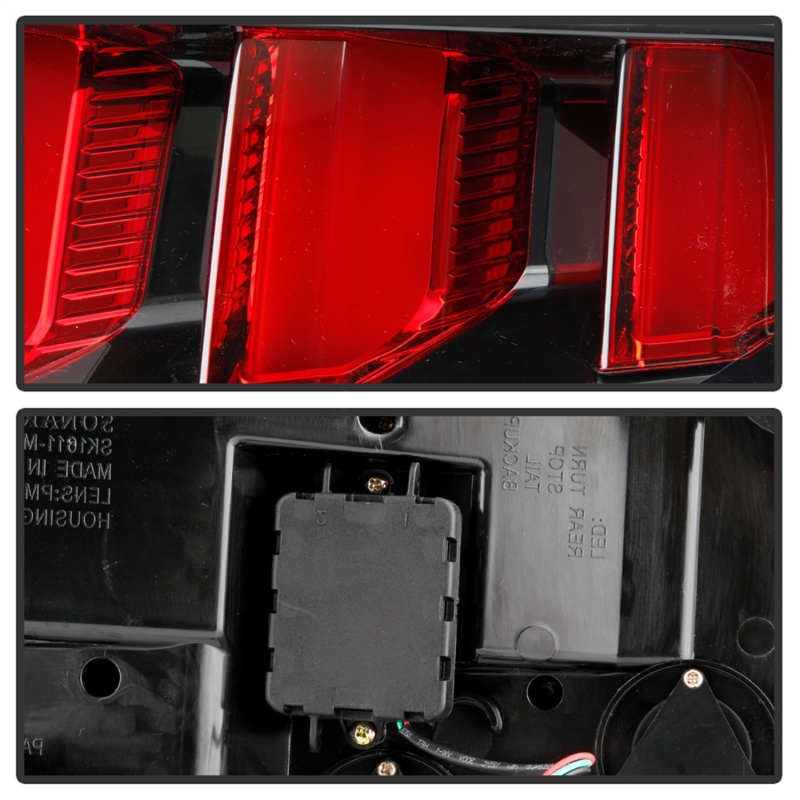 Introducing the Ford Mustang LED Tail Lights - SPYDER - Red Light Bar w/Sequential Turn Signal - Black - '10-'12. Transform your Mustang's lighting with these high-quality, stylish tail lights that provide an updated look and enhanced functionality.