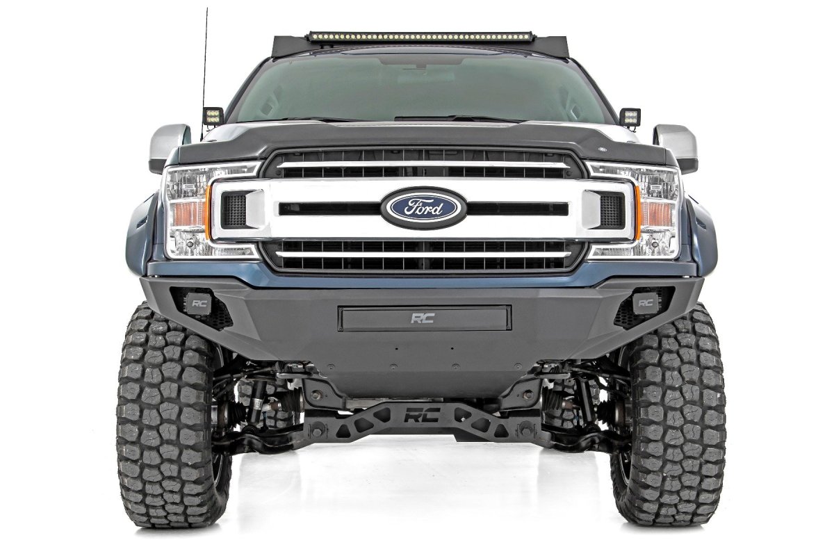 Ford F-150 Front Bumper - Rough Country - High Clearance, Skid Plate, LED Cubes and Light Bar - Flat Black - '18-'20