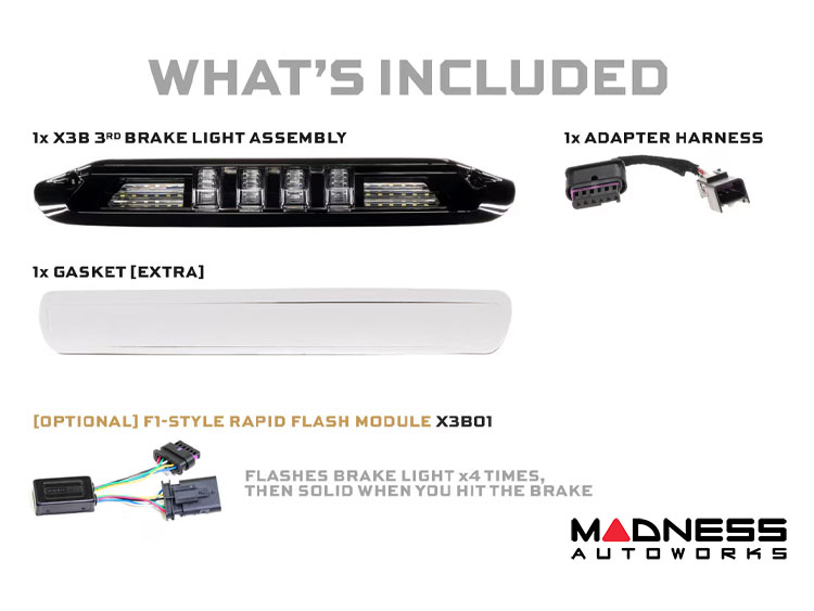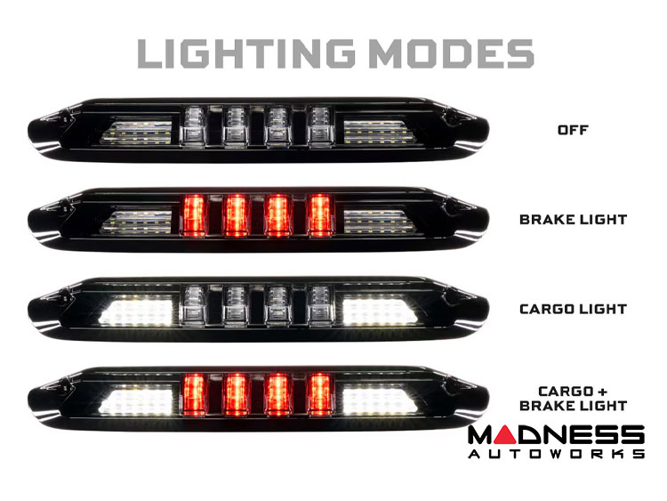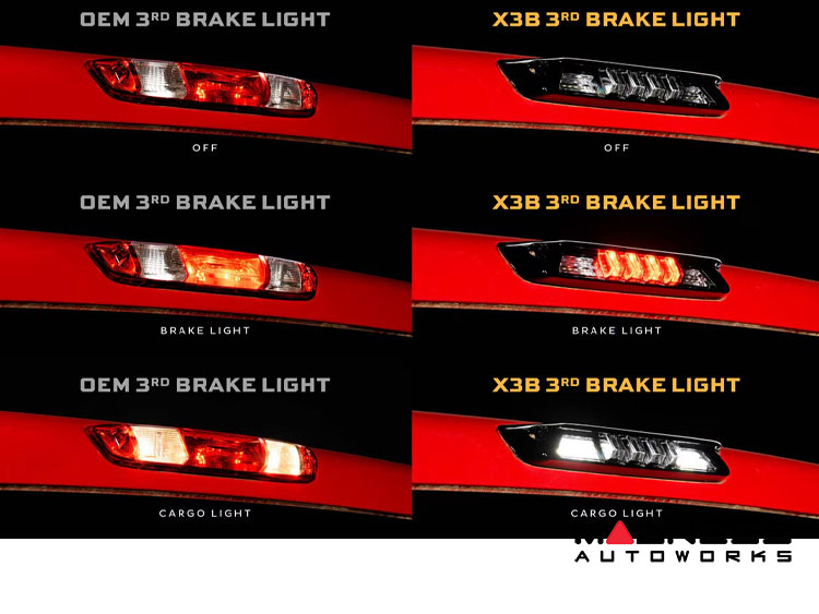 Engineered for both performance and aesthetics, the Morimoto X3B LED Third Brake Light features modern 3D brake light optics combined with white bed illumination. These optics are crafted from robust polycarbonate and powered by 3W LEDs to offer superior performance and durability. Whether cruising during the day or navigating at night, this brake light ensures optimal visibility, enhancing your vehicle's road presence. Furthermore, the quad brake light optics are paired with rail-style bed lights to cover every section of your truck bed, eliminating dark spots for efficient utility. Installation is streamlined and straightforward, designed to fit directly into existing mounting points with remarkable plug-and-play compatibility with your truck's stock wire harness—no modifications necessary. This lighting solution complies with DOT and SAE regulations, prioritizing safety on every journey, and is supported by a five-year warranty for your peace of mind.